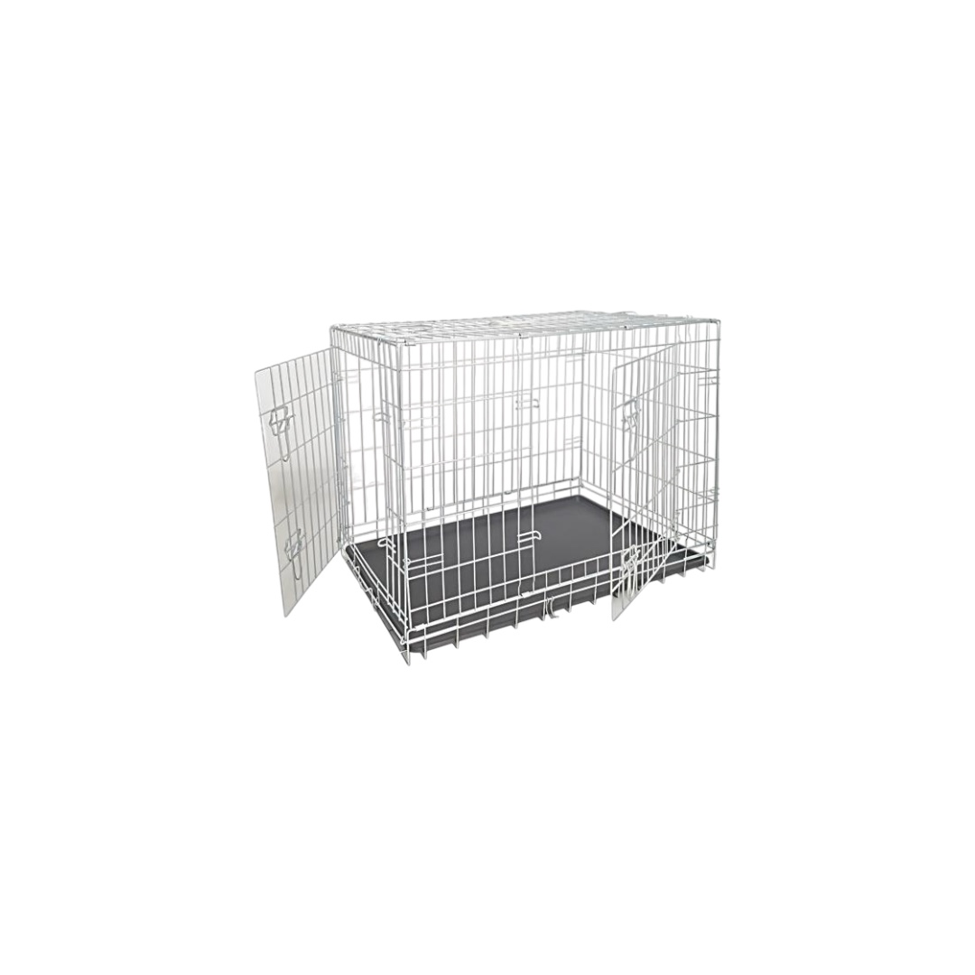 “GALVANIZED METAL DOG ​​CRATE: The indoor galvanized metal dog crate is perfect for providing your pet with a shelter where he will feel protected. Your dog will feel less alone and you will no longer have to worry about possible teasing when you are not at homePRACTICAL AND SPACIOUS: The park guarantees the necessary comfort for medium to small dogs, allowing them to stand up. It is very light and can be used comfortably in the carTWO DOORS: The two doors are located one on the long side and the other on the short side, so that the dog can choose the one he prefers. They open and close from the outside very easilyROBUST AND EASY TO CLEAN: The galvanized metal bars and the ABS bottom make the cage strong and resistant. The bottom can be easily removed for easy cleaningEASY TO STORE: When not in use, it can be folded into itself in seconds, saving spaceDimensions: 64X48X54”