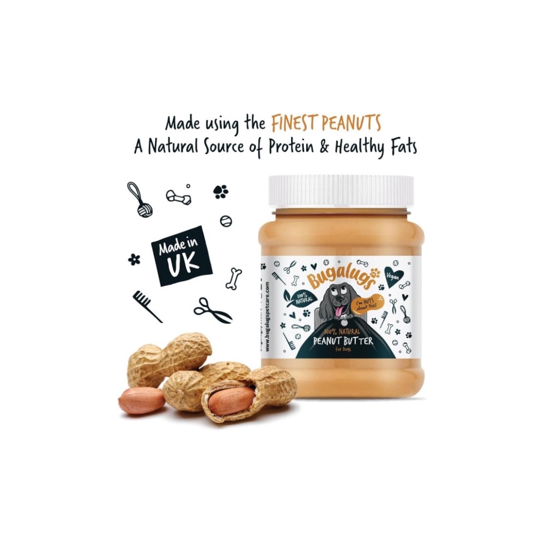 “Dogs go barking mad for Bugalugs Peanut Butter! 100% natural protein rich treat, free from nasties, packed full of healthy fats and with no added sugar or salt, our human grade peanut butter paste is not only perfect for your canine companion, but you could eat it too!Did you know that most peanut butter food formulas are not safe for dogs? This is not something that can be said for Bugalugs Dog Peanut Butter! Our specially formulated peanut butter paste for dogs contains only 100% roasted peanuts and nothing else, making it the only option for all dog breeds young and old!Peanut butter for dogs is not only a delicious treat, but it is also excellent for hiding medication in that may otherwise be difficult for your dog to take. It is also excellent for use in training or as a distraction during unwanted bath times! Four-legged friend get bored easily?Our peanut butter 100% roasted nut dog paste is the perfect treat for bored dogs and puppies. Simply spread the paste on lick mats for dogs or pet feeding mat. Alternatively, try stuffing the tasty creamy peanut butter paste into a toy to keep your canine occupied for hours.A fantastic healthy source of protein, swap out the regular dog biscuits and generic snacks for a delicious doggy treat packed with nut protein, healthy fats, and vitamins!This is a complementary food for dogs, to be used as a treat or a reward. The paste can be spread on/in your dog’s chew toys or on our Bugalugs Licking Mat as a boredom breaker. Always ensure fresh waster is accessible to your dog. This is a natural product so separation may occur.Made with 100% roasted peanuts, nothing elseRich in protein and healthy fatsA delicious treat for dogsNo added salt or sugarGreat as a treat or rewardNo xylitolNo Palm Oil”