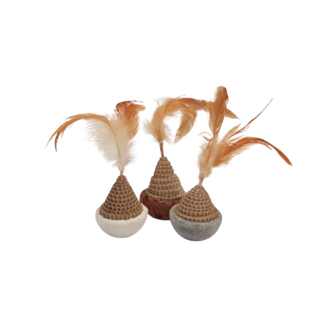 “The hemisphere toy is a combination of ecological paper and plush, making it very light and comfortable for the animal to tug and carry. It also has feathers that will awaken the instinct of a true hunter in your cat. If you want your pet to go crazy with happiness, this toy will be perfect. The oscillating movements that the toy performs will encourage your quadruped to play.Size: 12cm”