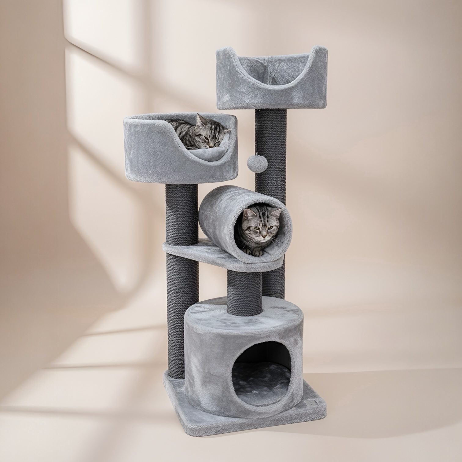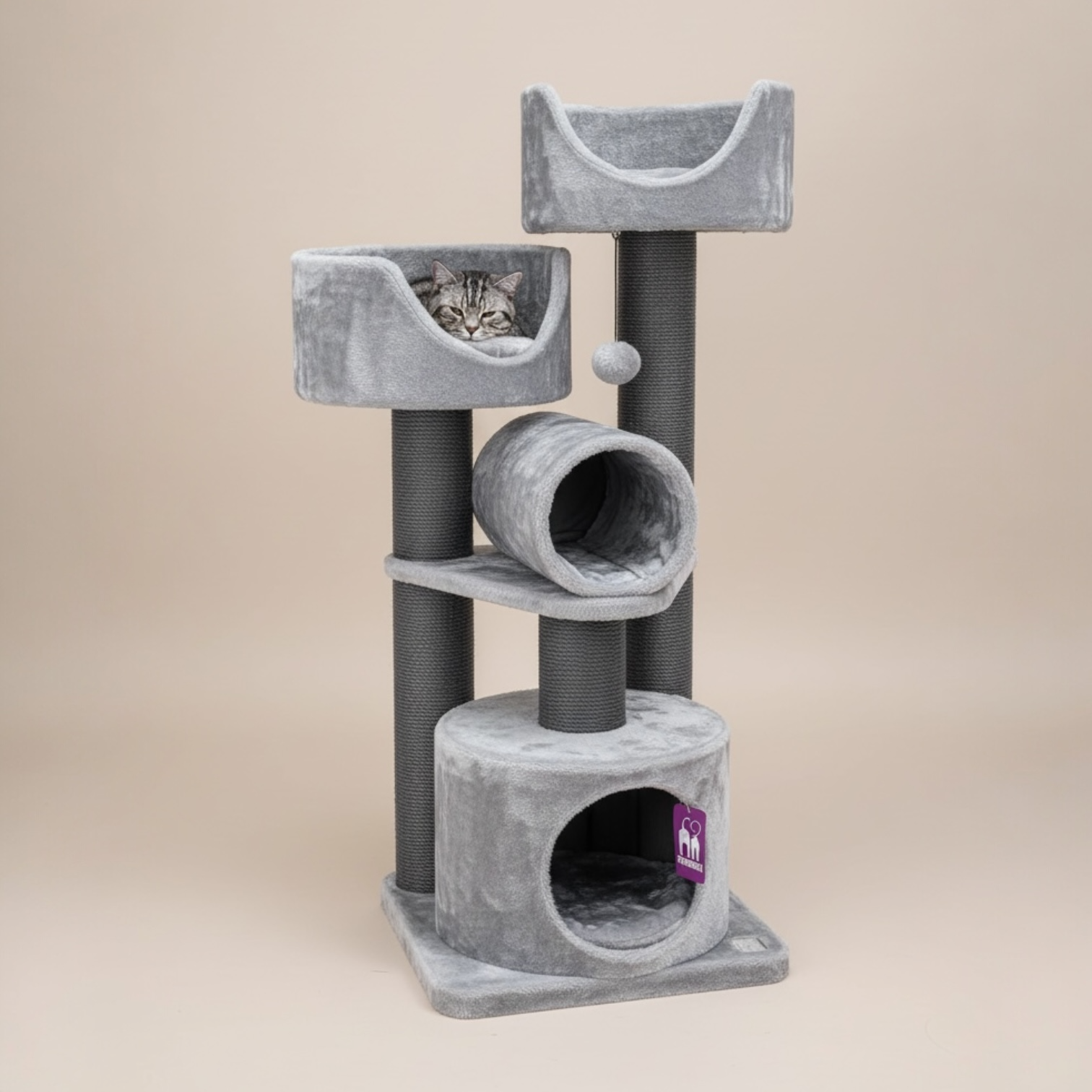 With three 12-centimetre thick scratching posts, velvety soft plush, two lounge baskets, a play tunnel, a toy and a lovely sleeping house, this beautiful scratching furniture is fully equipped to entertain your cats.
