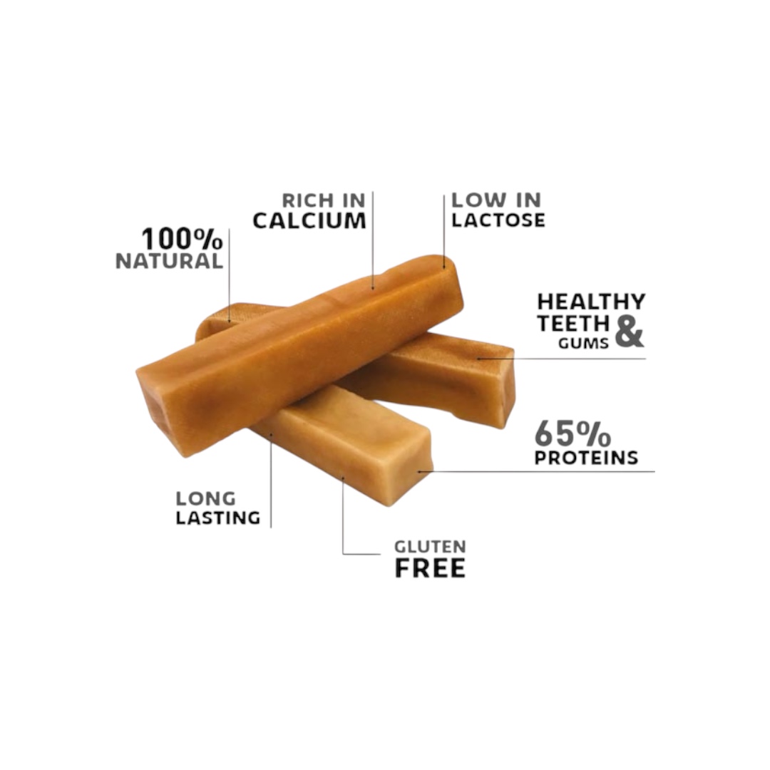 “CHURPI CHEESE TREAT 15-17 CM FOR DOGS 10-25KGS.Churpi bars find their origin in the Himalayan mountains. Originally made for human consumption, they are still widely consumed by the Himalayan people and their dogs. They are made from a mixture of skim milk from yak. A very small amount of lime juice and salt is added to coagulate (harden) the milk, which is then compressed into flat cloth molds and dried by smoking for 28 days to give the bars their unique flavor.”