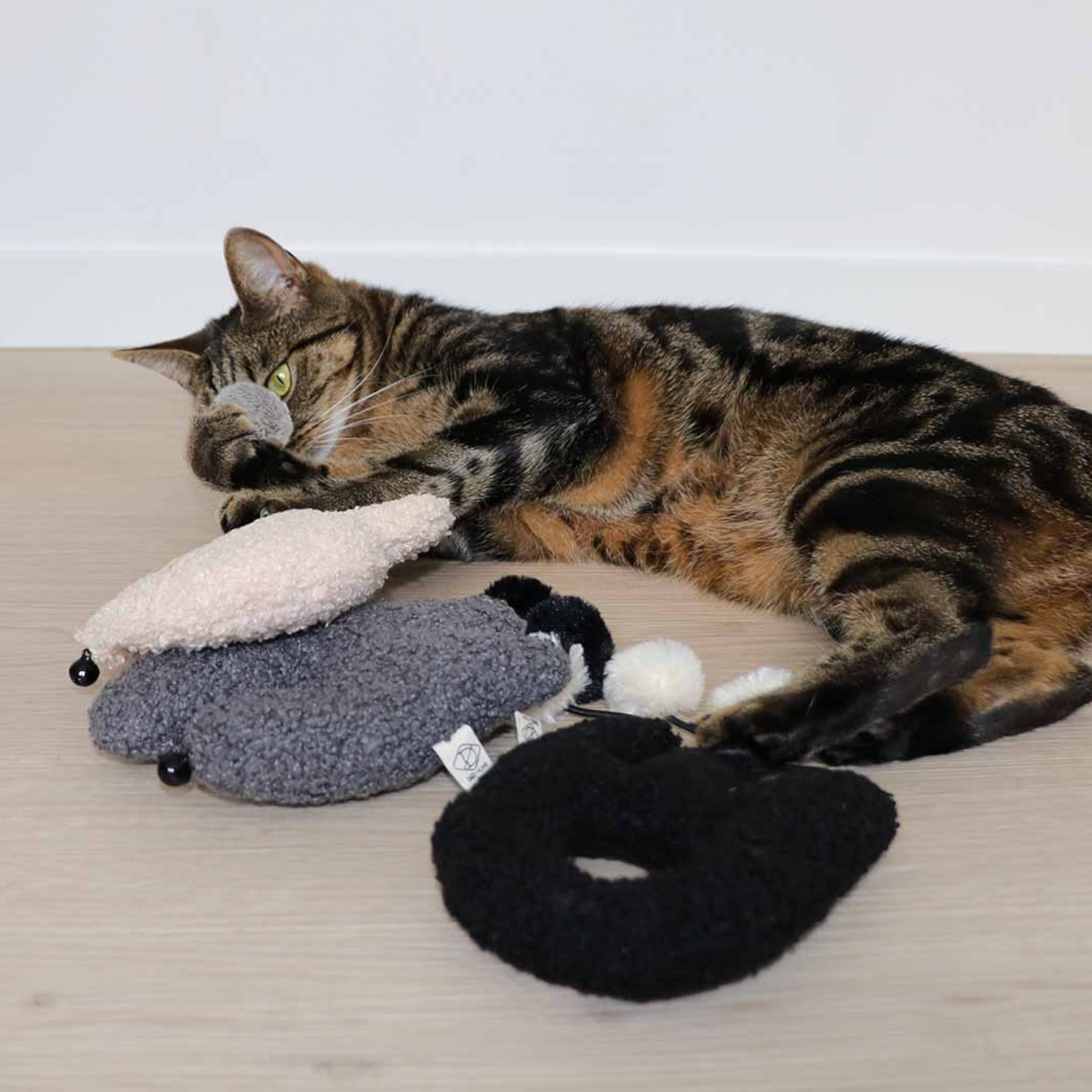 “SpecificationsMade of soft teddy fabric for hours of cuddling funEquipped with crinkle foil, bell, and plush ball for extra playtime funStimulates the natural hunting and playing instinct of every catContains crinkle foilMade from sturdy materials for long-lasting playtime”