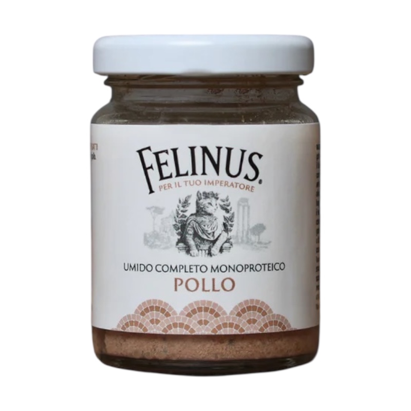 Thanks to the high capacity of jar cooking to preserve food naturally, you can be sure of offering a  natural and healthy meal  to your cat  without the use of artificial flavourings, preservatives or colourings . Felinus wet food is rich in Omega 3 and vitamin A, valid antioxidants and anti-inflammatories, important for the cardiovascular system. It also contains selenium, beta-carotene and vitamins CD-B6-B12 which promote the growth of muscle mass, maintain healthy skin, coat and eyesight. Felinus wet food is a low-calorie product perfect for maintaining your cat’s ideal weight. INGREDIENTS: Tuna 70%, Tuna cooking broth. ADDITIVES: Nutritional additives (per kg): Vit. A 2000 Ul Vit. D3 200 Ul Vit. E 10 mg/kg Taurine 500 mg/kg, Zinc 40 mg/kg Manganese 8 mg/kg ANALYTICAL COMPONENTS: Crude protein 13% Crude fat 2.00% Crude fibre 0.5% Crude ash 2.00% Moisture 78.00% Metabolisable energy: 87.5 kcal/100g RECOMMENDED RATION: The indicative daily ration is 2 jars per day for an average weight cat, taking into account that the daily requirement depends on various factors such as breed, age, activity and deportment. Nutritional additives and their functions: Vitamin D3 (240 IU/kg) → Essential for calcium absorption and bone health. Vitamin E (95 mg/kg) → Powerful antioxidant that protects cells from oxidative stress. Vitamin C (50 mg/kg) → Supports the immune system and skin health. Zinc (13 mg/kg, glycine chelate and zinc oxide) → Essential for skin, coat and immune system. Copper (sulfate pentahydrate, 0.5 mg/kg) → Helps produce red blood cells and maintain coat color. Manganese (sulfate monohydrate, 0.5 mg/kg) → Necessary for metabolism and bone formation. Iodine (0.4 mg/kg, calcium iodate anhydrous) → Important for thyroid function. Taurine (800 mg/kg) → Essential for cardiac and visual health in cats. Tocopherols from vegetable oils (natural antioxidant) → Help preserve the freshness of the product