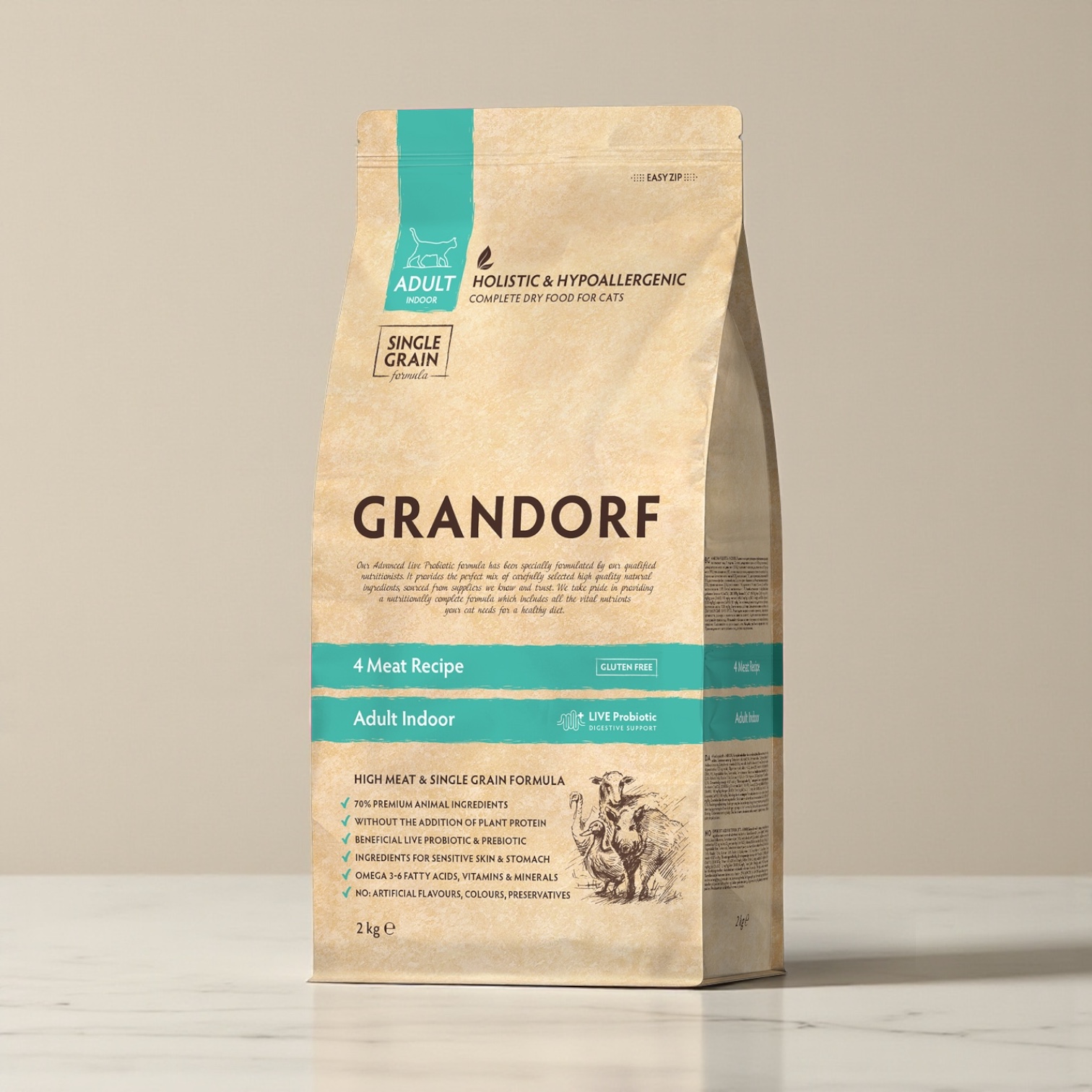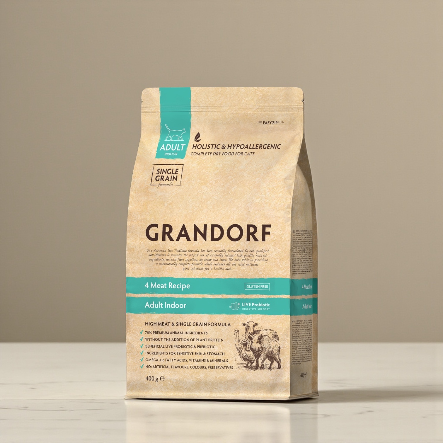 -For adult cats with normal activity, sensitive digestion or allergy prone.-A moderate protein and fat content helps to keep the pet’s weight and muscle mass in optimum shape.-Carefully selected, natural, hypoallergenic ingredients, help prevent allergic reactions and food intolerances, ensuring immune and digestive health.-A billion live probiotics daily support gut microflora, improve digestion, nutrient absorption and prevent allergies.IngredientsDehydrated turkey meat (15%), Dehydrated duck meat (15%), Dehydrated wild boar meat (15%), Whole grain brown rice, Dehydrated lamb meat (10%), Fresh turkey meat (9%), Turkey fat (4%), Linseed, Chicory roots powder (natural source of prebiotics: FOS and inulin), Brewer’s yeast (a natural source of MOS and bèta glucans), Salmon oil (1%), Dried Antarctic krill (natural source of EPA and DHA, 1%), Vegetable fibre, Dried apple, Dried cranberries, Mojave yucca.AnalysisAnalytical Constituents: Crude protein 32%; Crude fibre 2,5%; Crude fat 14%; Crude ash 7,5%; Moisture 6%; Calcium (Ca) 1,6%; Phosphorus (P) 1,2%; Magnesium (Mg) 0,1%; Omega 6 fatty acids 1,9%; Omega 3 fatty acids 1,7%. Metabolizable energy: 4107 kcal/kg. Nutritional supplements: Vitamin A (3a672a) 20000 IU/kg; Vitamin D3 (3a671) 1500 mg/kg; Vitamin E (3а700) 600 mg/kg; Taurine (3a370) 1500 mg/kg; L-carnitine (3a910) 100 mg/kg. Trace elements: Copper (3b405) 5,0 mg/kg; Zinc (3b605) 100 mg/kg; Manganese (3b503) 15 mg/kg; Iodine (3b202) 1,5 mg/kg; Selenium (3b801) 0,2 mg/kg. Antioxidants: tocopherol-rich extracts from plant oils 1000 mg/kg. Zootechnical additives: Gut flora stabilisers: Enterococcus faecium DSM10663/NCIMB 10415 109 КОЕ.70% MEAT AND ANIMAL INGREDIENTSAll our foods are meat-based and contain only high-quality animal proteins. Animal protein is very valuable and contains all the essential amino acids for your pet and will fully meet his biological needs for meat nutrition.ONLY MEAT WITHOUT OFFALWe use the highest quality of meat, without bones or offal. This ensures that your pet receives a highly nutritious, easily digestible source of protein.HYPOALLERGENIC INGREDIENTSCarefully selected, natural, hypoallergenic ingredients, help prevent allergic reactions and food intolerances, ensuring immune and digestive health.ONLY ONE SOURCE OF CARBOHYDRATESWe use one source of carbohydrates to minimise the risk of food intolerances and allergies. Brown rice in the low-grain range and sweet potatoe in the grain-free range.LIVE PROBIOTICS AND PREBIOTICSOne billion live probiotics per 1kg and the latest generation of XOS prebiotics with natural omegas and antioxidants help support digestive, skin, coat and immune health.LOW-FEEDING RATEThanks to the nutritional quality of our natural ingredients and balanced composition, we have low feeding rations. So your pet will enjoy each package longer than usual.NO CHICKEN, NO PEAS, NO CORN, NO BEETROOTDoes not contain: corn, wheat, beetroot, peas, offal, eggs, chicken, chicken fat, salt, sugar, colourings, flavourings, soya and GMOs.