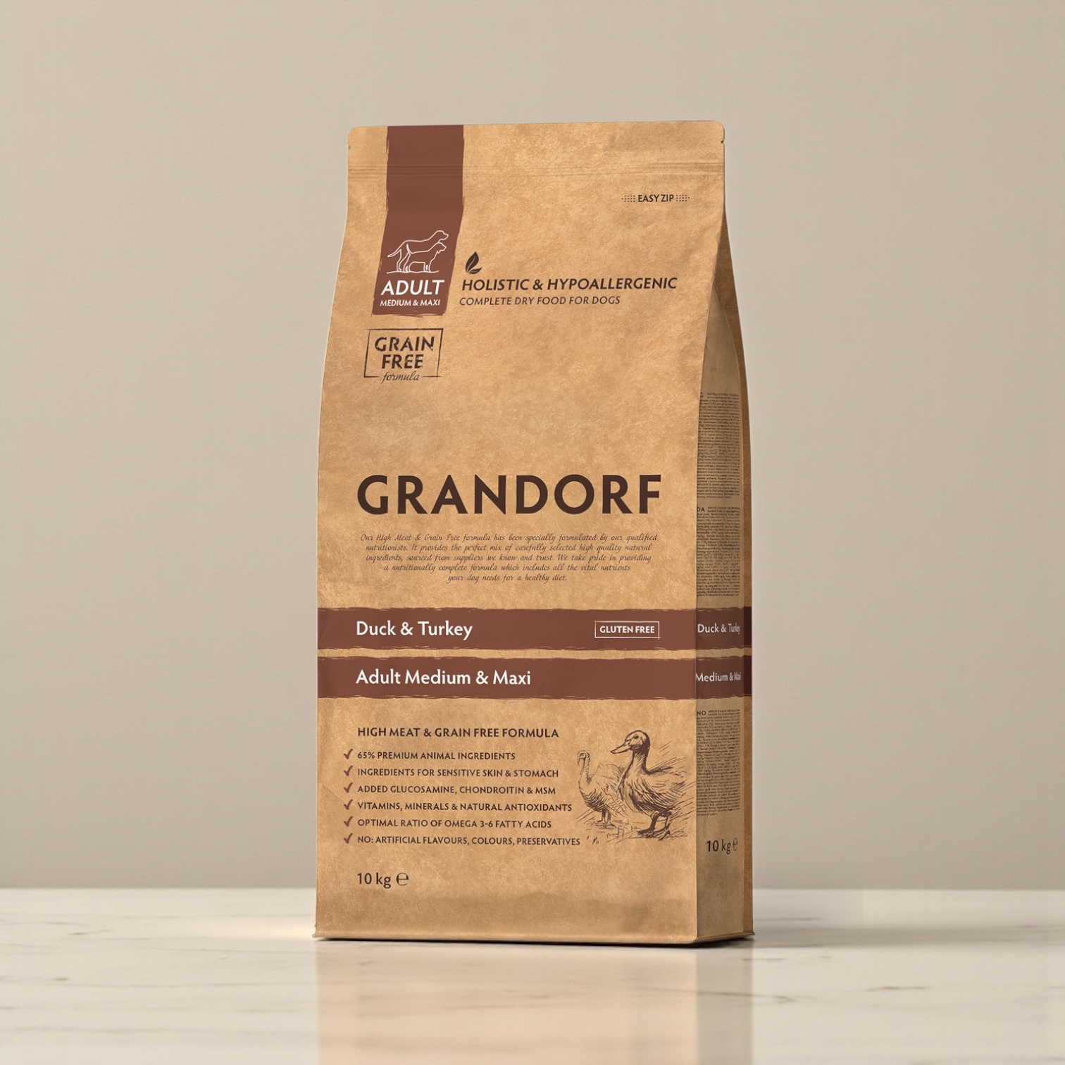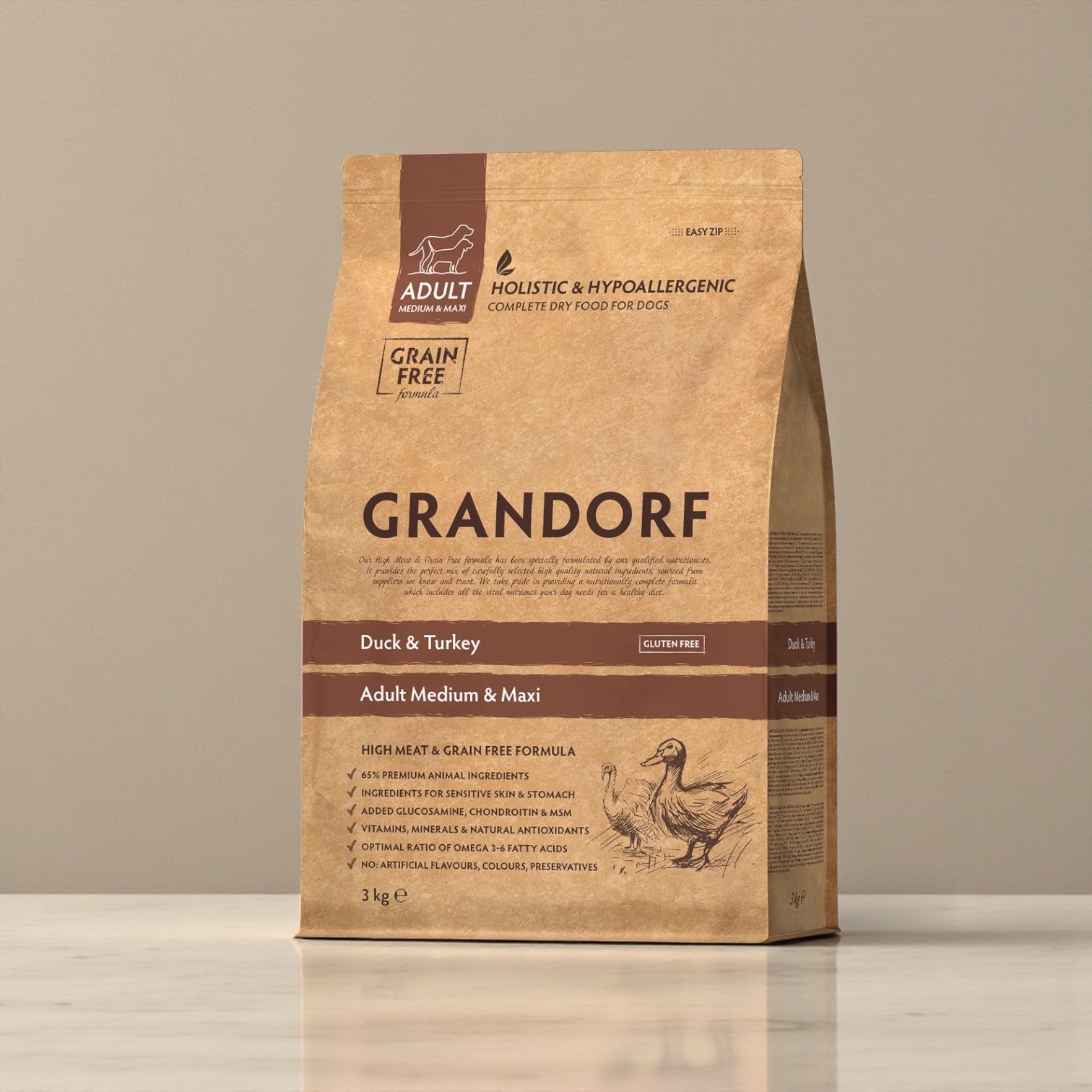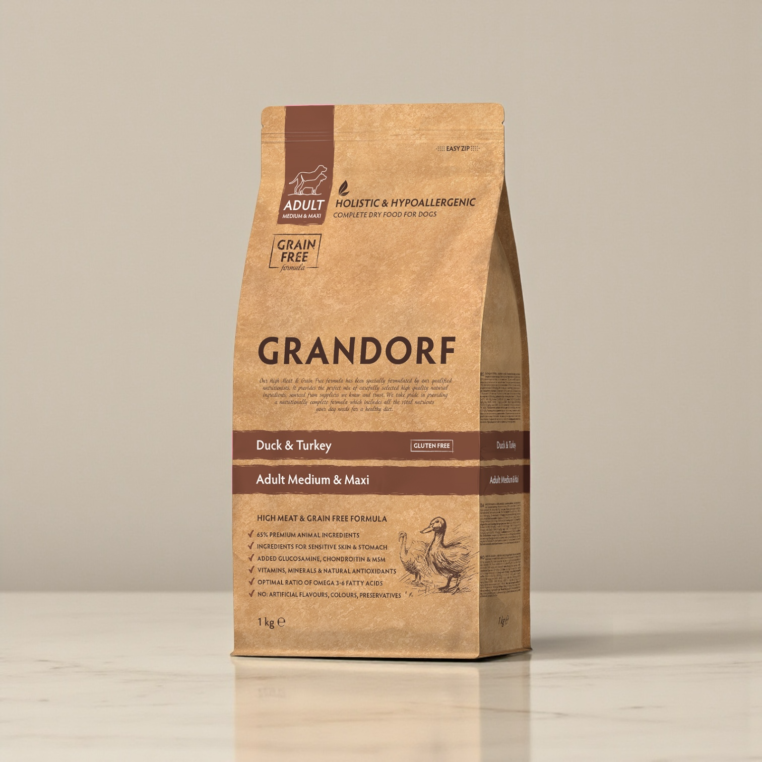 -For adult dogs of medium to large breeds with normal activity, sensitive digestion or allergy prone.-The excellent grain-free formula is an excellent alternative to cereals and is ideal for pets with sensitive digestion or those prone to grain allergies.-The grain-free, hypoallergenic formula combined with dietary duck and turkey meat helps prevent allergic reactions and food intolerances, ensuring immune and digestive health.IngredientsDehydrated duck meat (22%), Dehydrated turkey meat (22%), Dried sweet potatoes, Fresh duck meat (12%), Turkey fat (7%), Dried spinach, Chicory roots powder (natural source of prebiotics: FOS and inulin), Carob flour, Dried apple, Salmon oil (1%), Dried Antarctic krill (natural source of EPA and DHA, 1%), Linseed, Glucosamine (1500 mg/kg), Chondroitin sulphate (1000 mg/kg), MSM (Methyl sulphonyl methane, 40 mg/kg), Dried cranberries, Mojave yucca.AnalysisAnalytical Constituents: Crude protein 26%; Crude fibre 3,5%; Crude fat 16%; Crude ash 7,5%; Moisture 9%; Calcium (Ca) 1,3%; Phosphorus (P) 1%; Omega 6 fatty acids 2,5%; Omega 3 fatty acids 0,4%. Metabolizable energy: 4120 kcal/kg. Nutritional supplements: Vitamin A (3a672a) 15000 IU/kg; Vitamin D3 (3a671) 1500 IU/kg; Vitamin E (3а700) 150 mg/kg; Vitamin C (3a312) 100 mg/kg; Taurine (3a370) 1000 mg/kg; DL-methionine technically pure (3c301) 140 mg/kg. Trace elements: Iron (3b103 – 3b106) 45 mg/kg; Copper (3b405 – 3b406) 13 mg/kg; Zinc (3b605 – 3b606) 50 mg/kg; Manganese (3b503 – 3b504) 40 mg/kg; Iodine (3b201) 1,5 mg/kg; Selenium (3b801) 0,2 mg/kg. Antioxidants: tocopherol-rich extracts from plant oils 1000 mg/kg.65% MEAT AND ANIMAL INGREDIENTSAll our foods are meat-based and contain only high-quality animal proteins. Animal protein is very valuable and contains all the essential amino acids for your pet and will fully meet his biological needs for meat nutrition.ONLY MEAT WITHOUT OFFALWe use the highest quality of meat, without bones or offal. This ensures that your pet receives a highly nutritious, easily digestible source of protein.HYPOALLERGENIC INGREDIENTSCarefully selected, natural, hypoallergenic ingredients, help prevent allergic reactions and food intolerances, ensuring immune and digestive health.ONLY ONE SOURCE OF CARBOHYDRATESWe use one source of carbohydrates to minimise the risk of food intolerances and allergies. Brown rice in the low-grain range and sweet potatoe in the grain-free range.LOW-FEEDING RATEThanks to the nutritional quality of our natural ingredients and balanced composition, we have low feeding rations. So your pet will enjoy each package longer than usual.NO CHICKEN, NO PEAS, NO CORN, NO BEETROOTDoes not contain: corn, wheat, beetroot, peas, offal, eggs, chicken, chicken fat, salt, sugar, colourings, flavourings, soya and GMOs.