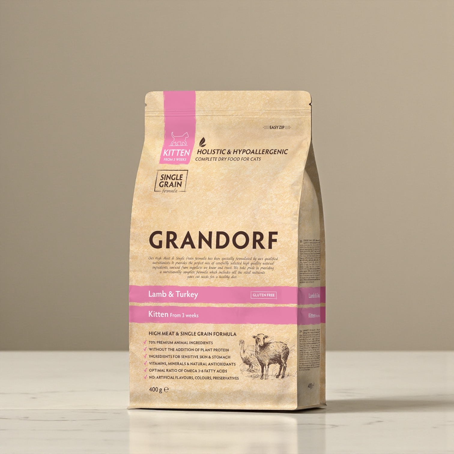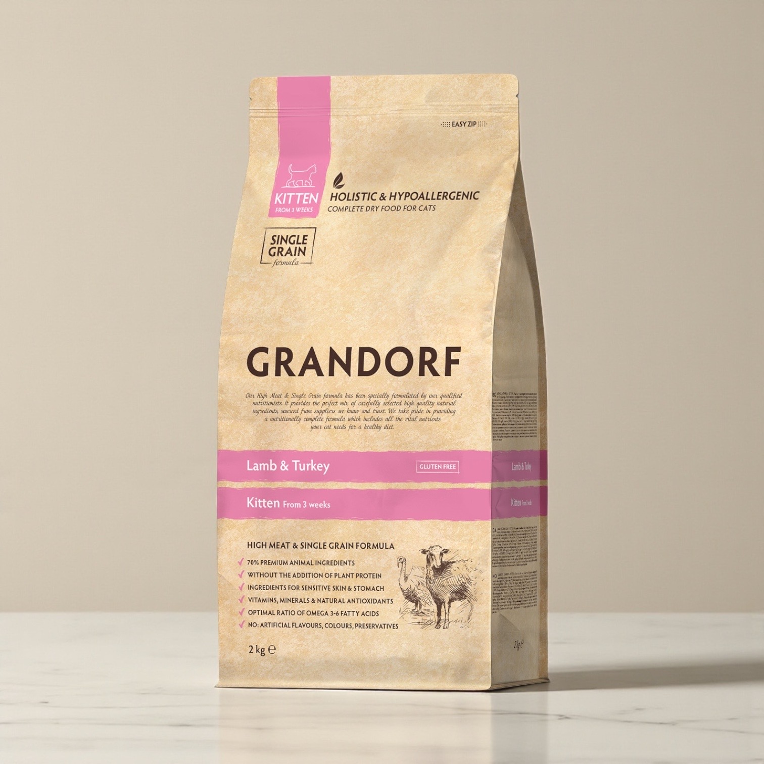 -For kittens from 3 weeks of age, pregnant and lactating cats.-Ideal for the delicate digestive system of kittens. A high content of essential proteins, healthy fats, amino acids and vitamins ensures optimal energy values for the healthy growth and development of kittens.-Carefully selected, natural, hypoallergenic ingredients, help prevent allergic reactions and food intolerances, ensuring immune and digestive health.IngredientsDehydrated lamb meat (23%), Dehydrated turkey meat (22%), Whole grain brown rice, Fresh lamb meat (8%), Fresh turkey meat (8%), Turkey fat (7%), Chicory roots powder (natural source of prebiotics: FOS and inulin), Salmon oil (1%), Dried Antarctic krill (natural source of EPA and DHA, 1%), Brewer’s yeast (a natural source of MOS and bèta glucans), Vegetable fibre, Dried cranberries, Mojave yucca.AnalysisAnalytical Constituents: Crude protein 34%; Crude fibre 2,5%; Crude fat 22%; Crude ash 7,5%; Moisture 6%; Calcium (Ca) 1,2%; Phosphorus (P) 1%; Magnesium (Mg) 0,09%; Omega 6 fatty acids 3,7%; Omega 3 fatty acids 0,8%. Metabolizable energy: 4490 kcal/kg. Nutritional supplements: Vitamin A (3a672a) 20000 IU/kg; Vitamin D3 (3a671) 1500 IU/kg; Vitamin E (3а700) 600 mg/kg; L-carnitine (3a910) 50 mg/kg; Taurine (3a370) 1500 mg/kg. Trace elements: Copper (3b405) 5,0 mg/kg; Zinc (3b605) 100 mg/kg; Manganese (3b503) 15 mg/kg; Iodine (3b202) 1,5 mg/kg; Selenium (3b801) 0,2 mg/kg. Antioxidants: tocopherol-rich extracts from plant oils 1000 mg/kg.70% MEAT AND ANIMAL INGREDIENTSAll our foods are meat-based and contain only high-quality animal proteins. Animal protein is very valuable and contains all the essential amino acids for your pet and will fully meet his biological needs for meat nutrition.ONLY MEAT WITHOUT OFFALWe use the highest quality of meat, without bones or offal. This ensures that your pet receives a highly nutritious, easily digestible source of protein.HYPOALLERGENIC INGREDIENTSCarefully selected, natural, hypoallergenic ingredients, help prevent allergic reactions and food intolerances, ensuring immune and digestive health.ONLY ONE SOURCE OF CARBOHYDRATESWe use one source of carbohydrates to minimise the risk of food intolerances and allergies. Brown rice in the low-grain range and sweet potatoe in the grain-free range.LOW-FEEDING RATEThanks to the nutritional quality of our natural ingredients and balanced composition, we have low feeding rations. So your pet will enjoy each package longer than usual.NO CHICKEN, NO PEAS, NO CORN, NO BEETROOTDoes not contain: corn, wheat, beetroot, peas, offal, eggs, chicken, chicken fat, salt, sugar, colourings, flavourings, soya and GMOs.