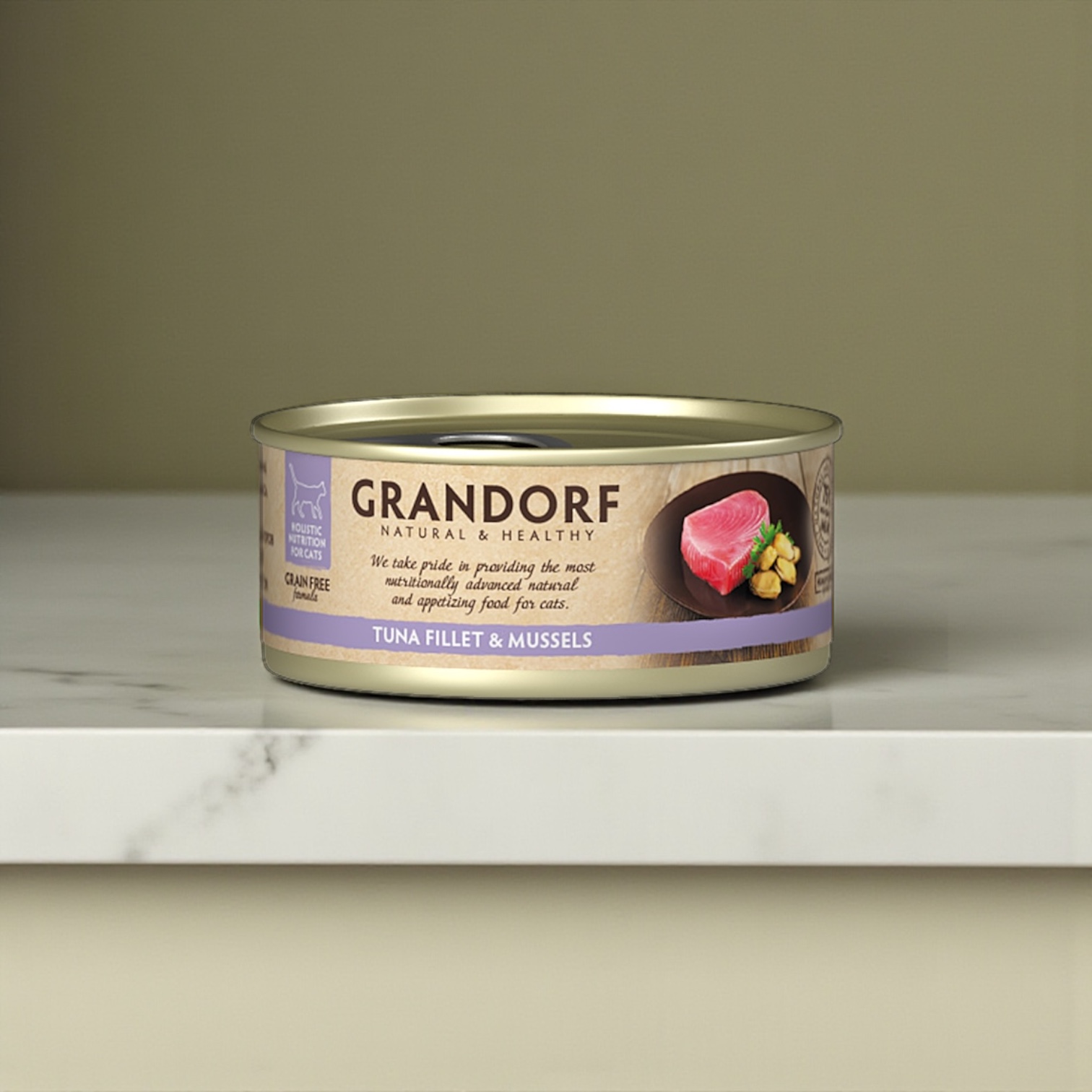 -For cats of all ages with normal activity, sensitive digestion or allergy prone.-All-natural cat food made from selected meat fillets, cooked in their own juices. Just meat and nothing else – the perfect complement to dry food, to diversify the cat’s diet.-Only high-quality steamed or chilled, not frozen raw materials are used.IngredientsTuna fillet (65%), Mussels (10%), Tuna broth (24%), Potato (1%).AnalysisAnalytical Constituents: Protein 16%; Fat 0,1%; Fibre 0,25%; Ash 1%; Moisture 82,65%. Metabolizable energy: 750 kcal/kg.75% MEATAll our foods are meat-based and contain only high-quality animal proteins. Animal protein is very valuable and contains all the essential amino acids for your pet and will fully meet his biological needs for meat nutrition.ONLY MEAT WITHOUT OFFALWe use the highest quality of meat, without bones or offal. This ensures that your pet receives a highly nutritious, easily digestible source of protein.NOTHING SUPERFLUOUSNo hormones, antibiotics, preservatives, colourings, flavourings or other additives.
