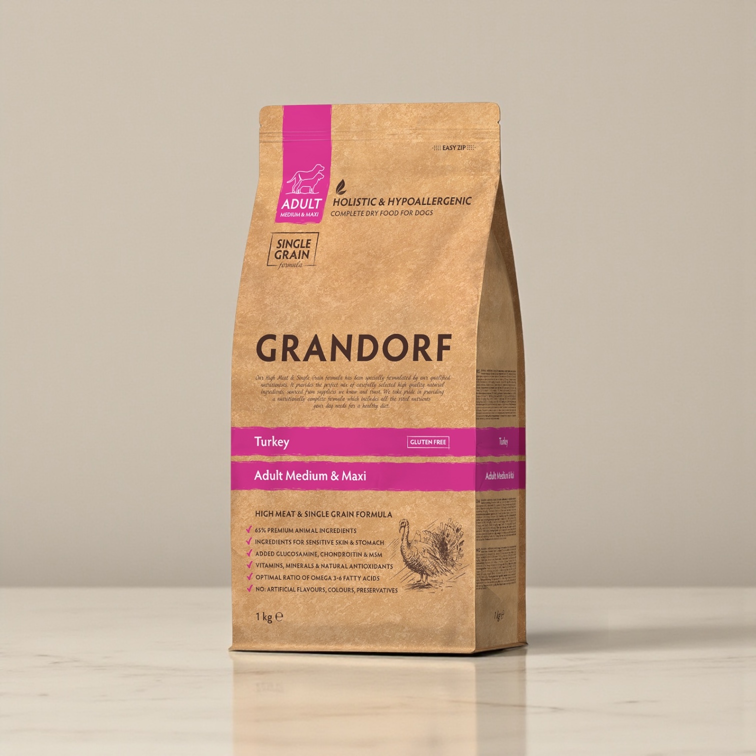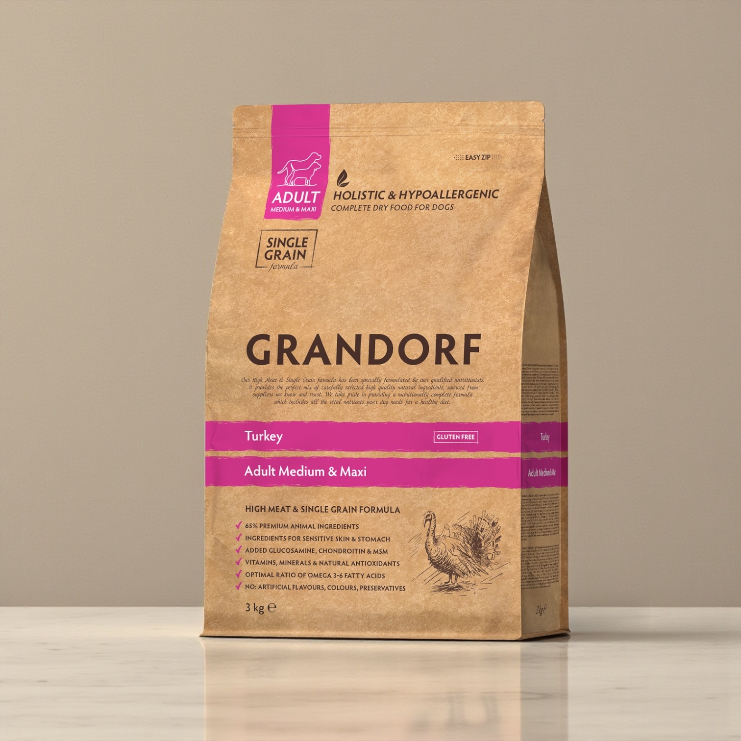 -Fresh, hypoallergenic and nutritious turkey meat has a positive effect on the dog’s digestive system. Thanks to its monoprotein formula, hypoallergenic ingredients, single grain, gluten-free, the food has excellent digestibility, high nutritional value and helps your pet stay healthy and cheerful for many years to come.