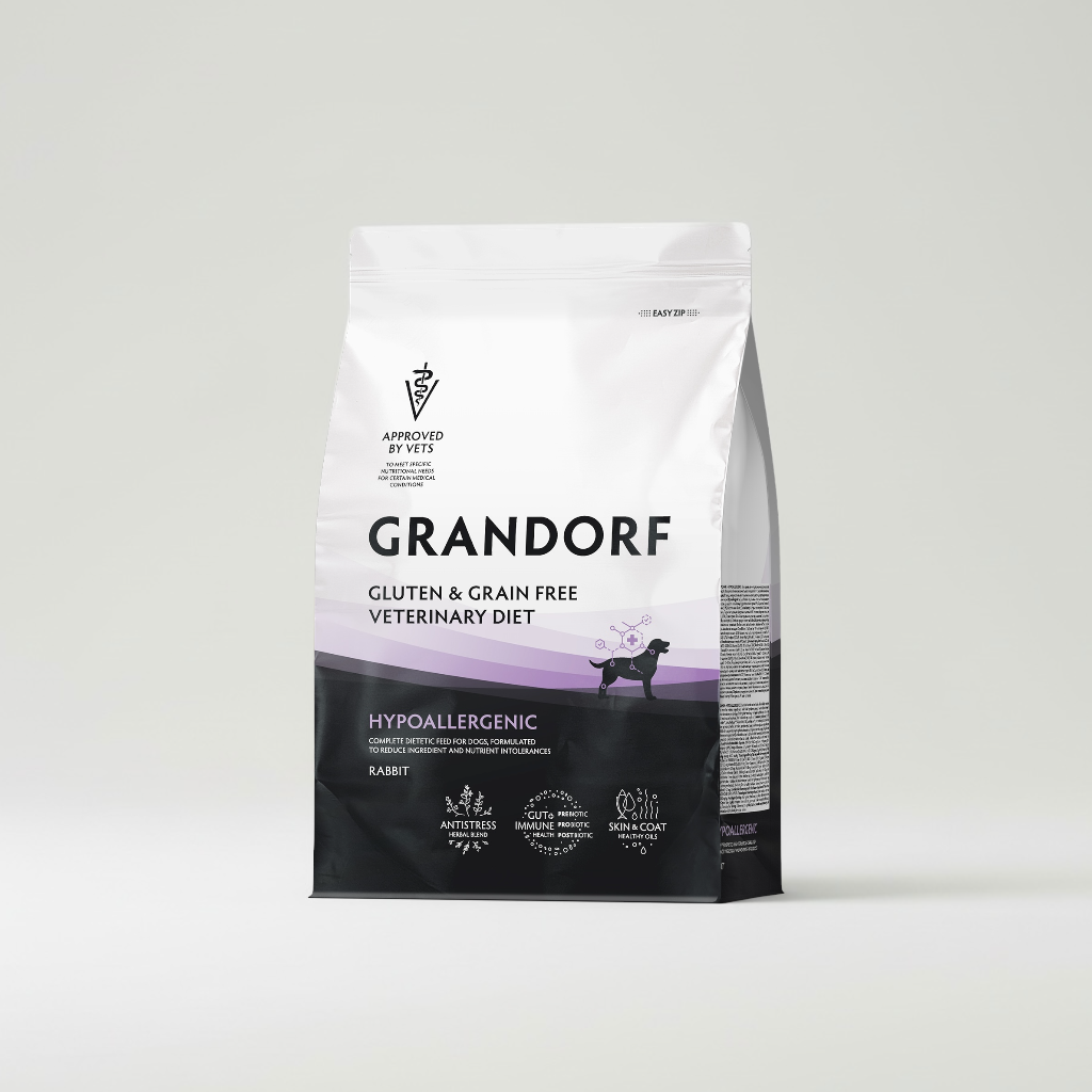 Grandorf Vet – Hypoallergenic – Rabbit 3kg -Complete dietary food for dogs used in cases of food allergies or food intolerances.A formula based on hydrolyzed rabbit protein. Hydrolyzed protein has a low molecular weight and minimizes the risk of allergies. Thanks to pre/pro/postbiotics and a balanced balance of omega-3 (EPA, DHA) and omega-6 (LA) fatty acids, it effectively supports healthy skin and digestive system.-VETERINARIAN APPROVED-Grain and gluten freeOur grain-free and gluten-free formulas make our foods easy to digest and ideal for pets with sensitive digestion or food allergies.-Hydrolyzed protein formulaWe use only hydrolyzed animal protein from rabbit meat to minimize the risk of food intolerances and allergies in your pet.-Anti-stress herbal complexDried herbs such as chamomile and passionflower have a calming effect, reduce stress levels and have a positive effect on the overall well-being of your pet.-Pre/pro/postbioticsProbiotics (beneficial bacteria), prebiotics (their food), and postbiotics (the products of their fermentation and synthesis) work together to support animal health: probiotics colonize the intestines, creating a healthy biocenosis and limiting the population of pathogenic microorganisms; prebiotics nourish friendly microflora, helping it colonize; and postbiotics strengthen the immune system, improve digestion, and reduce inflammation in the digestive tract, providing comprehensive care for the body as a whole, which is especially beneficial after illness, allergies, and stress.-Salmon and algae oilSalmon and algae oils are rich in essential Omega-3 fatty acids, including DHA (docosahexaenoic acid) and EPA (eicosapentaenoic acid), which have a beneficial effect on all organs and systems of the body.-IndicationsElimination dietAn allergy of an alimentary nature, manifested by disorders of the skin and/or digestive tractFood intoleranceChronic intestinal inflammationExocrine pancreatic insufficiency (EPI)Chronic diarrheaSmall intestinal bacterial overgrowth (SIBO)-We strongly recommend that if your pet has any health concerns, consult your veterinarian before using this food. Decisions on the duration of dietary therapy or dietary changes should only be made on the advice of your veterinarian.ContraindicationsPancreatitis (including previous pancreatitis)-Hyperlipidemia-RecommendationsBefore using or continuing to feed your pet, consult your veterinarian. Feed Hypoallergenic dry food for 3 to 8 weeks. If symptoms of intolerance disappear, the food can be used for up to one year.-CompoundHydrolyzed rabbit protein* (25%), Sweet potato**, Potato flakes**, Turkey fat (13%), Potato protein*, Chicory root powder (natural source of prebiotics: FOS and inulin), Flaxseed, Minerals, Hydrolyzed yeast (natural source of MOS and beta-glucans), Algae oil (natural source of EPA and DHA) (0.5%), Dried herbs (yucca schidigera, chamomile, passionflower, Roman chamomile), Fermentation extract (Lactobacillus acidophilus), Fermentation by-product Bacillus subtilis, Fermentation by-product Aspergillus niger, Protein of single-celled organisms (Bacillus subtilis, Bacillus licheniformis, Trichoderma viride). *Protein source. **Carbohydrate source.-AnalysisAnalytical constituents: Crude protein 21%; Crude fat 19%; Omega-3 fatty acids 1.1%; EPA 0.04%; DHA 0.08%; Omega-6 fatty acids 3.1%; Linoleic acid 3%; Crude ash 6%; Crude fiber 2.5%; Moisture 9%; Calcium (Ca) 0.7%; Phosphorus (P) 0.5%; Sodium (Na) 0.3%; Potassium (K) 0.7%; Magnesium (Mg) 0.08%; Glycine (average value) 19.36 g/kg. Metabolizable energy: 4012 kcal/kg. Food additives: Vitamin A (3a672a) 20,000 IU/kg; Vitamin D3 (3a671) 2,000 IU/kg; Vitamin E (3a700) 200 mg/kg; Vitamin C (3a300) 80 mg/kg; Vitamin B1 (3a821) 12.3 mg/kg; Vitamin B2 (3a825i) 10 mg/kg; Calcium-D-pantothenate (3a841) 25 mg/kg; Vitamin B6 (3a831) 5 mg/kg; Vitamin B12 (cyanocobalamin) 0.1 mg/kg; Niacinamide (3a315) 50 mg/kg; Folic acid (3a316) 2.5 mg/kg; Biotin (3a880) 0.3 mg/kg; Taurine (3a370) 1,500 mg/kg; Choline chloride (3a890) 2,000 mg/kg; L-Carnitine (3a910) 100 mg/kg; DL-Methionine (3c301) 1000 mg/kg; Iron (iron (II) sulfate monohydrate – iron amino acid chelate hydrate) 15+30 mg/kg; Iodine (calcium iodate anhydrous) 1.5 mg/kg; Copper (copper sulfate pentahydrate – copper amino acid chelate hydrate) 10+3 mg/kg; Manganese (manganese sulfate monohydrate – manganese amino acid chelate hydrate) 30+10 mg/kg; Zinc (zinc sulfate monohydrate – zinc amino acid chelate hydrate) 20+30 mg/kg; Selenium (sodium selenite) 0.2 mg/kg. Antioxidants: tocopherol-rich extracts from vegetable oils (1b306(i)) 1000 mg/kg. Zootechnical additives: Intestinal flora stabilizers: 4b1707, Enterococcus faecium (DSM 10663 / NCIMB 10415): 10 9 CFU.
