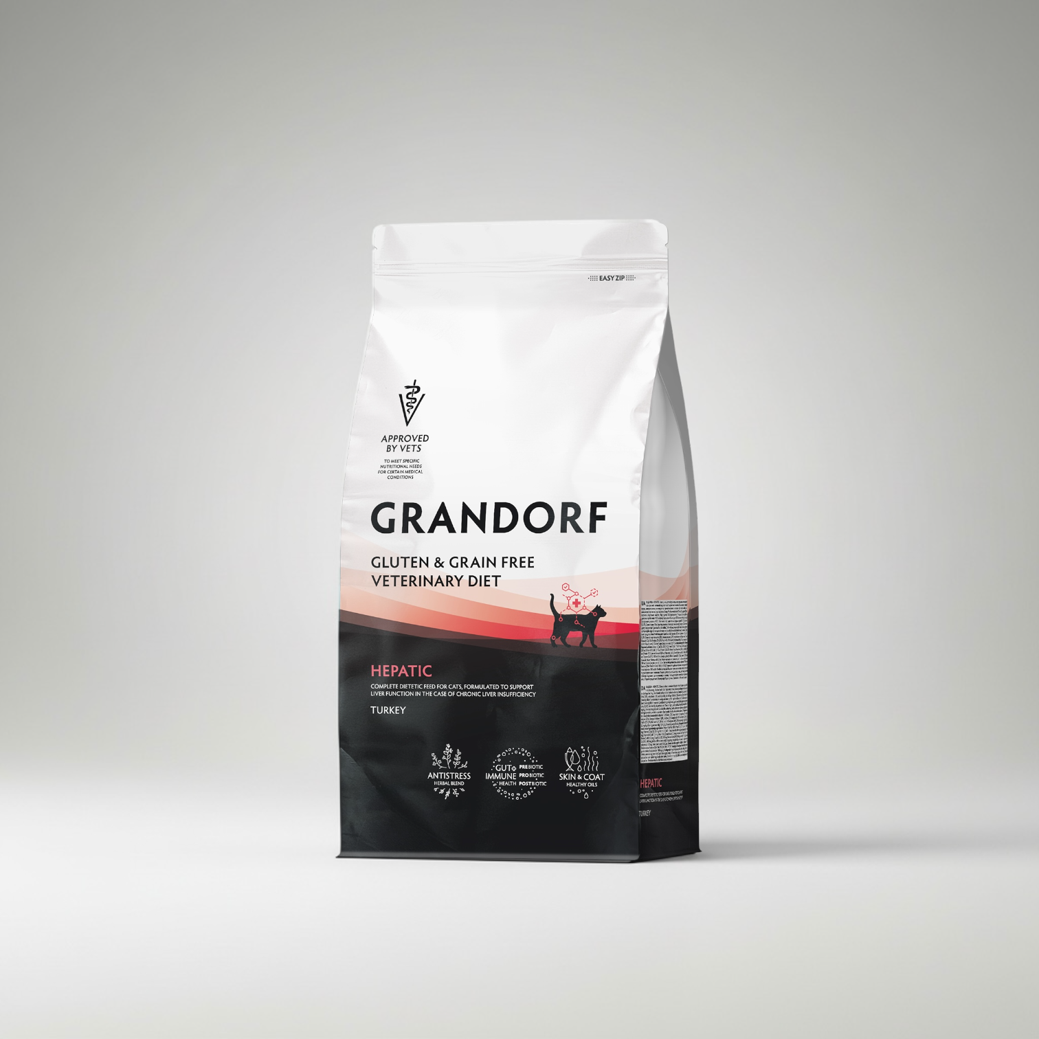 Grandorf Vet – Hepatic – Turkey 2kgComplete dietary food for cats, designed to support liver function in chronic liver failure.A boneless turkey formula that supports liver function by reducing copper and providing moderate amounts of high-quality, easily digestible proteins.-VETERINARIAN APPROVEDGrain and gluten freeOur grain-free and gluten-free formulas make our foods easy to digest and ideal for pets with sensitive digestion or food allergies.One type of animal proteinWe limit animal protein sources to minimize the risk of food intolerances and allergies in your pet.-FRESH BONELESS MEATWe use premium meat, free of bones and by-products. This ensures your pet receives a highly nutritious, easily digestible source of protein.-Anti-stress herbal complexDried herbs such as chamomile and passionflower have a calming effect, reduce stress levels and have a positive effect on the overall well-being of your pet.-Pre/pro/postbioticsProbiotics (beneficial bacteria), prebiotics (their food), and postbiotics (the products of their fermentation and synthesis) work together to support animal health: probiotics colonize the intestines, creating a healthy biocenosis and limiting the population of pathogenic microorganisms; prebiotics nourish friendly microflora, helping it colonize; and postbiotics strengthen the immune system, improve digestion, and reduce inflammation in the digestive tract, providing comprehensive care for the body as a whole, which is especially beneficial after illness, allergies, and stress.-Salmon and algae oilSalmon and algae oils are rich in essential Omega-3 fatty acids, including DHA (docosahexaenoic acid) and EPA (eicosapentaenoic acid), which have a beneficial effect on all organs and systems of the body.-IndicationsLiver failureCholangitis / CholangiohepatitisCholestasis with hepatocyte damageCopper metabolism disorderPortosystemic shuntWe strongly recommend that if your pet has any health concerns, consult your veterinarian before using this food. Decisions on the duration of dietary therapy or dietary changes should only be made on the advice of your veterinarian.ContraindicationsHyperlipidemia-Hepatic lipidosisPregnancyLactation periodGrowth period-Individual intolerance-RecommendationsConsult your veterinarian before use. Feed Hepatic dry food for up to 4 months during the initial course of treatment.-CompoundBoneless turkey* 35% (fresh 20%, dehydrated 15%), Sweet potato, Potato flakes, Turkey fat (12%), Potato protein*, Lignocellulose, Chicory root powder (natural source of prebiotics: FOS and inulin), Hydrolyzed turkey protein* (3%), Flaxseed, Minerals, Hydrolyzed yeast (natural source of MOS and beta-glucans), Algae oil (natural source of EPA and DHA) (0.5%), Salmon oil (0.5%), Dried herbs (yucca schidigera, chamomile, passionflower, Roman chamomile), Dried stinging nettle (300 mg/kg), Fermentation extract (Lactobacillus acidophilus), Fermentation by-product Bacillus subtilis, By-product of Aspergillus niger fermentation, protein of single-celled organisms (Bacillus subtilis, Bacillus licheniformis, Trichoderma viride). *Specially selected proteins with a high degree of digestibility.-AnalysisAnalytical constituents: Crude protein 26%; Crude fat 22%; Omega-3 fatty acids 1.1%; EPA 0.12%; DHA 0.2%; Omega-6 fatty acids 3.8%; Linoleic acid 3.71%; Crude ash 6%; Crude fiber 5%; Moisture 6%; Calcium (Ca) 1%; Phosphorus (P) 0.7%; Sodium (Na) 0.2%; Potassium (K) 0.6%; Magnesium (Mg) 0.07%; Iron (average value) 120 mg/kg; Copper (total) 3.5 mg/kg; Glycine (average value) 12.47 g/kg. Metabolizable energy: 4030 kcal/kg. Food additives: Vitamin A (3a672a) 20,000 IU/kg; Vitamin D3 (3a671) 1,750 IU/kg; Vitamin E (3a700) 400 mg/kg; Vitamin C (3a300) 250 mg/kg; Vitamin B1 (3a821) 10 mg/kg; Vitamin B2 (3a825i) 8 mg/kg; Calcium-D-pantothenate (3a841) 16.3 mg/kg; Vitamin B6 (3a831) 8 mg/kg; Vitamin B12 (cyanocobalamin) 0.05 mg/kg; Niacinamide (3a315) 80 mg/kg; Folic acid (3a316) 5 mg/kg; Biotin (3a880) 0.2 mg/kg; Taurine (3a370) 1,500 mg/kg; Choline chloride (3a890) 2,000 mg/kg; L-Carnitine (3a910) 100 mg/kg; DL-methionine (3c301) 5,000 mg/kg; Iodine (calcium iodate anhydrous) 1.5 mg/kg; Manganese (manganese sulfate monohydrate) 15 mg/kg; Zinc (zinc sulfate monohydrate) 100 mg/kg; Selenium (sodium selenite) 0.2 mg/kg. Antioxidants: tocopherol-rich extracts from vegetable oils (1b306(i)) 1,000 mg/kg. Zootechnical additives: Intestinal flora stabilizers: 4b1707, Enterococcus faecium (DSM 10663 / NCIMB 10415): 10 9 CFU.