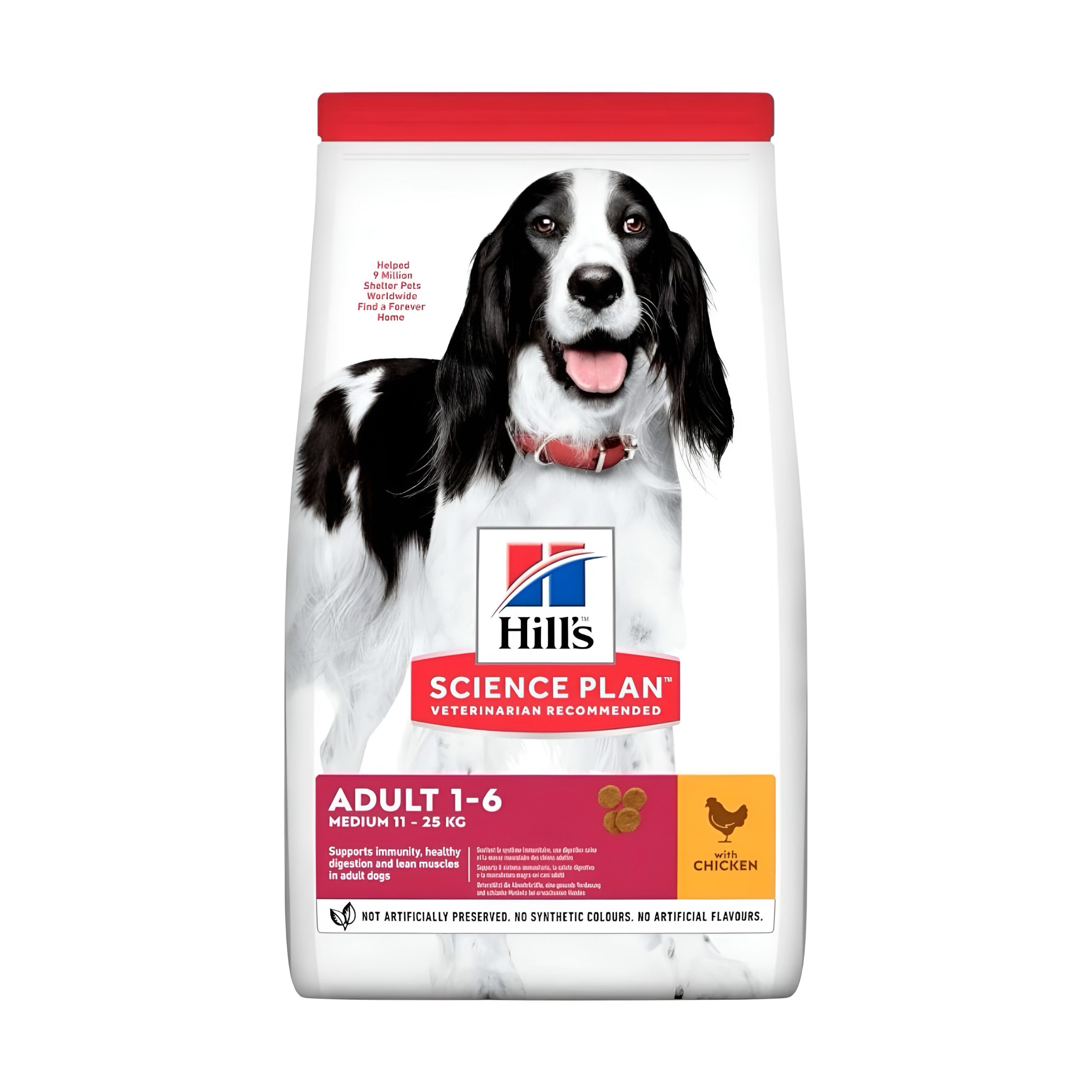 The HILL’S SCIENCE PLAN Adult Medium Breed Dog Food with Chicken is specially formulated to meet the energy needs of dogs throughout most of their lives. Made with high quality, easily digestible ingredients.Benefits: – Omega 6 and vitamin E for beautiful skin and coat– High quality protein to promote lean muscle– Easily digestible ingredients and fibre for healthy digestionIt is recommended for:Adult dogs aged 1 to 6 years.It is not recommended for:Puppies, pregnant or lactating bitches, or older dogs. During gestation and lactation, bitches should be fed Hill’s Science Plan Puppy Food.Helpful Tips:– Adjust feeding amounts as necessary to maintain optimal weight.– If you are unsure, ask your veterinarian.– New to this food? Mix increasing amounts of your pet’s new food with decreasing amounts of the old food over a 7-day period.– Keep fresh water available at all times!– Your pets nutritional needs may change as they age. Ask your vet at every checkup.– To prevent suffocation, keep the packaging out of the reach of pets and children.