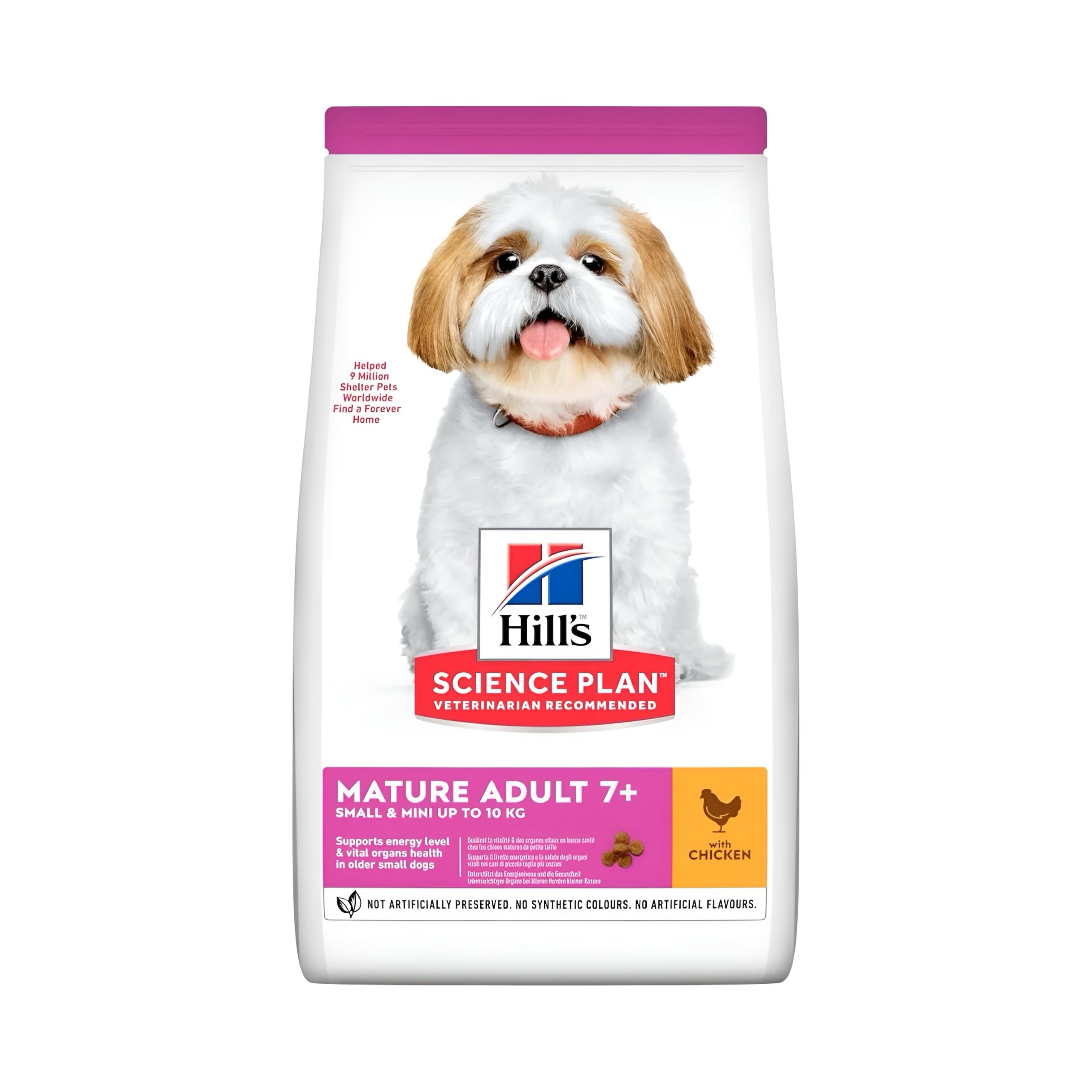 Big on Love, Small in Size. HILL’S SCIENCE PLAN Small & Mini Mature Adult 7+ dog food with Chicken is tailored nutrition to support graceful aging in Small & Mini dogs. Specially made with our smallest kibble & a synergistic blend of nutrients for energy & vigor.Balanced minerals for heart, kidney & bladder healthNourishing Omega-6 & Vitamin E blend for healthy skin & luxurious coatEasy-to-digest ingredients for healthy digestionContains our special Small & Mini antioxidant blend for lifelong immune supportRecommended for:Mature Adult dogs 7+ years of age that weigh up to 10kg when full grown.Not recommended for:Puppies, or adult dogs (< 7 years of age). Pregnant or nursing dogs. During pregnancy or nursing, dogs should be switched to HILL'S SCIENCE PLAN Puppy Small & Mini dog food.Chicken and turkey meal, wheat, brewers’ rice, brown rice, maize, animal fat, digest, barley, oats, dried beet pulp, vegetable oil, flaxseed, minerals, dried tomato pomace, dried citrus pulp, spinach powder.