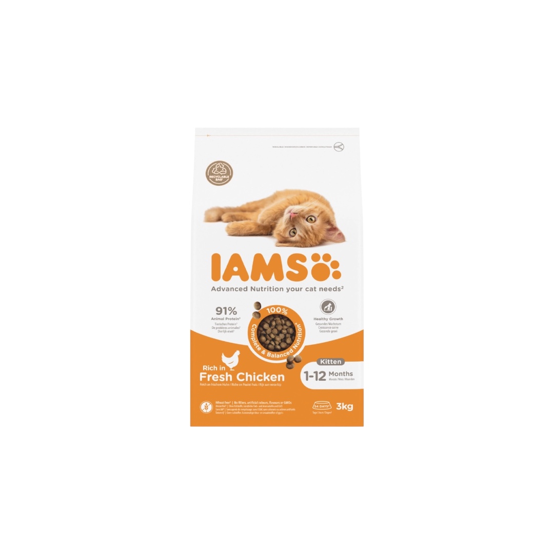 “Meet your kitten’s natural needs with IAMS Kitten chicken cat food.IAMS Advanced Nutrition dry kitten food with fresh chicken contains essential minerals and vitamin D to support strong bones and muscles for healthy growth. As essential nutrition for healthy brain development, all of our dry kitten food is fortified with DHA, which, like taurine, helps maintain healthy vision. For healthy digestion, the recipe contains a tailored fibre blend with prebiotics and beet pulp.Features:• 100% complete and balanced advanced kitten food• Contains 91% animal protein (out of total protein)• Essential minerals and vitamin D to support strong bones and muscles for healthy growth in kittens• With DHA as an essential nutrient for healthy brain development• With taurine and DHA to promote healthy vision• Specially tailored fibre blend with prebiotics and beet pulp for healthy digestion• No fillers, artificial colours, flavours or GMOsComposition: Dried Chicken & Turkey 38% (Chicken 23%, a natural source of taurine), Maize, Fresh Chicken (15%), Pork Fat, Rice, Dried Beet Pulp (2.4%), Sunflower Oil, Chicken Gravy, Fish Oil, Fish Meal, Fructooligosaccharides (0.5%), Brewer’s Dried Yeast, Potassium Chloride.”