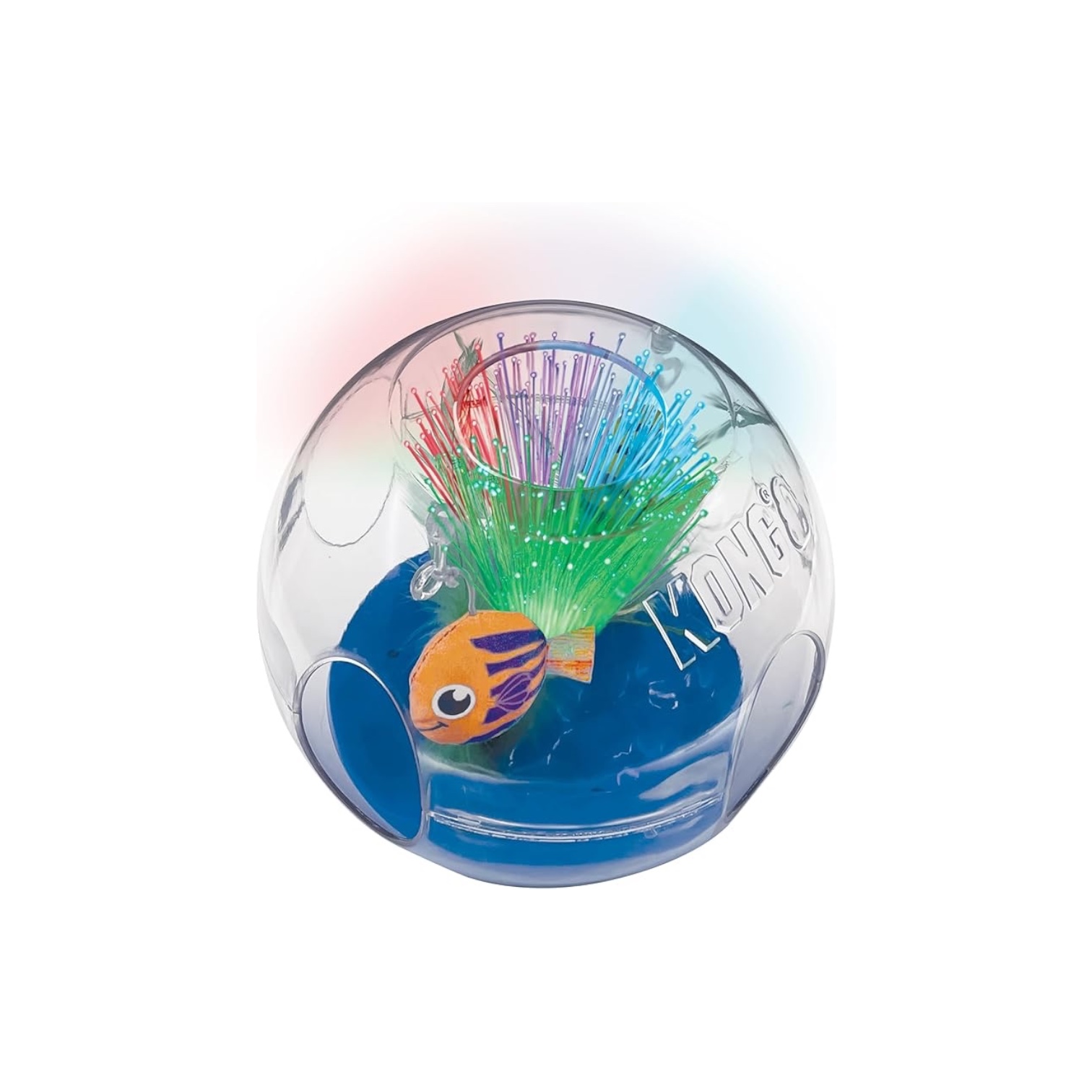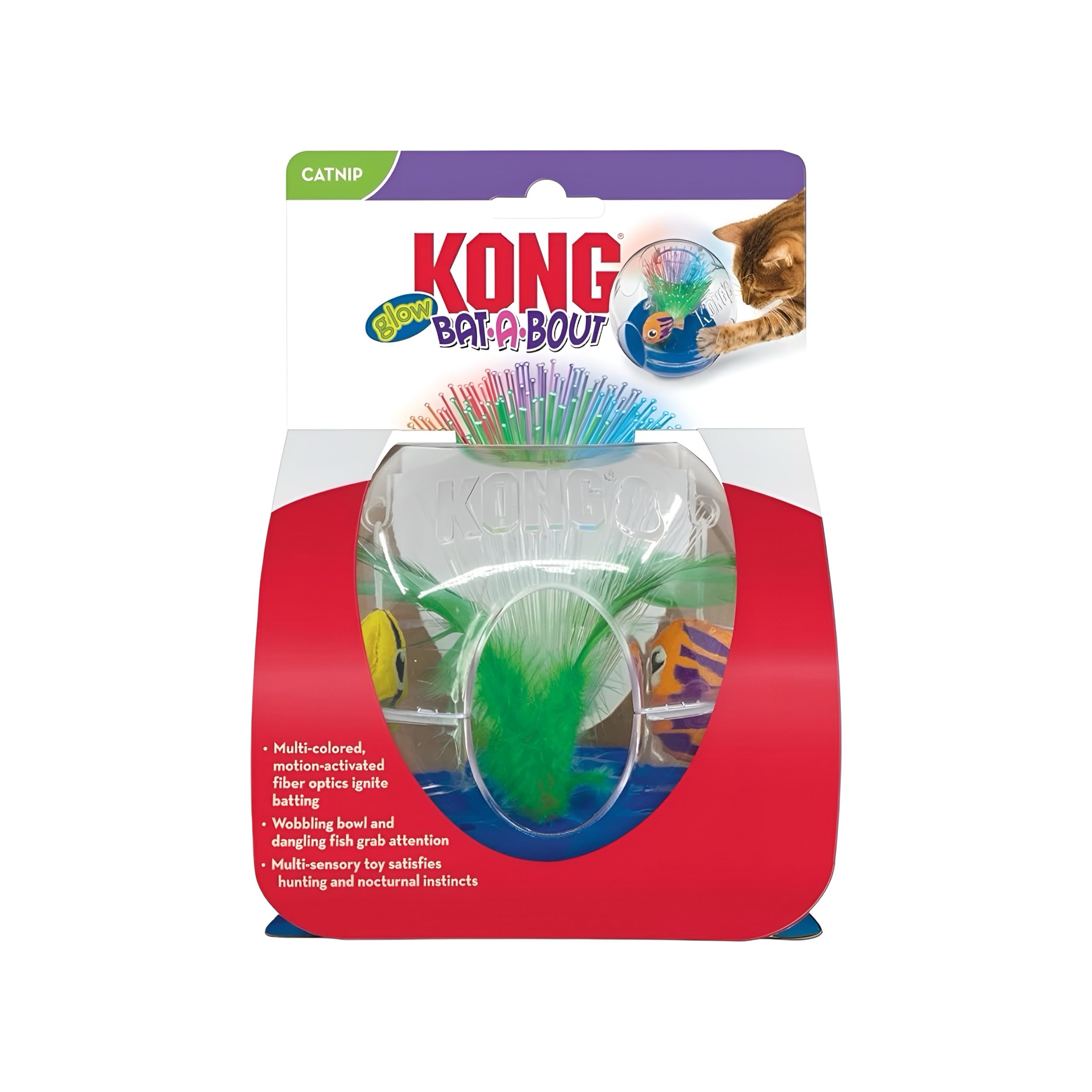 “Multi-colored, motion-activated fiber optics ignite battingWobbling bowl and dangling fish grab attentionMulti-sensory toy satisfies hunting and nocturnal instinctsBatteries included; on/off switchFish are filled with KONG Premium North American Catnip”