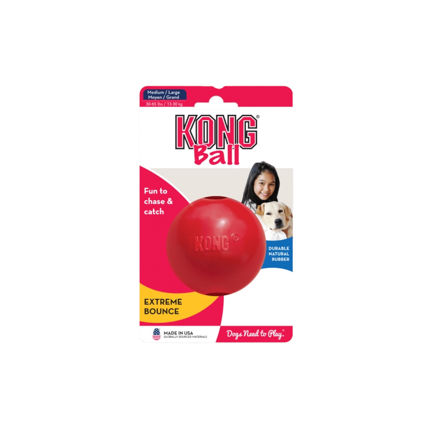 “The KONG Ball is the best bouncing and most durable ball on the market. Made of durable rubber that’s safe on the teeth and gums as they chew. The perfect toy for the dog that loves to fetch and chew.Key BenefitsMade from KONG Classic durable rubber.Perfect for games of fetch or for chew sessions.Extreme bounce and puncture resistant for long-lasting fun.Recommended by vets worldwide and are safe for teeth and gums while chewing.Available in two sizes: Small and Medium/Large, so you can pick the perfect size for your pup.”