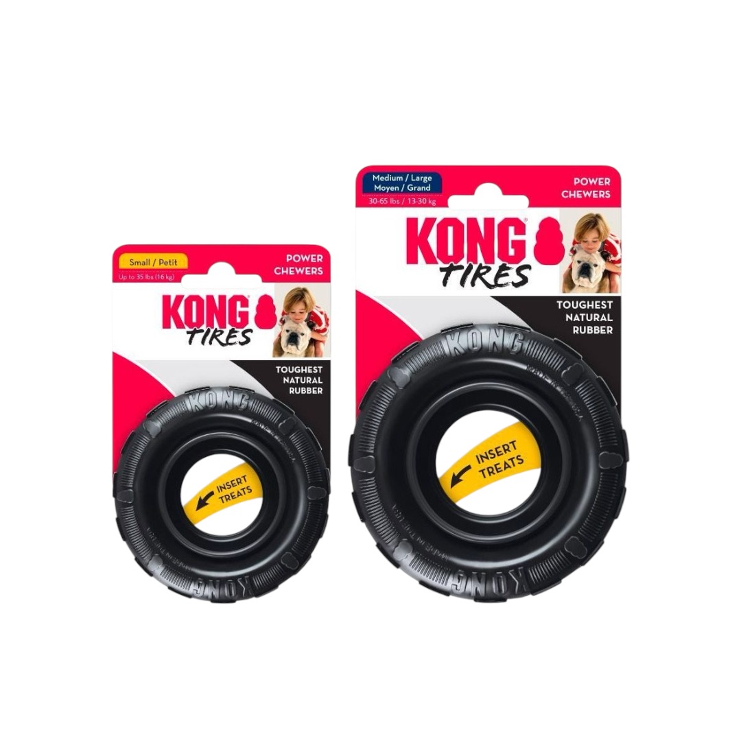 Durable Toy for Dogs: The KONG Tires is an entertaining dog toy constructed with KONG Extreme Natural Rubber for reliable durabilityProvides an Active Chewing Experience: The sidewalls are designed to double up and rebound when compressedVersatile Toy for Dog Treats: This tire-shaped dog toy features an inner wall that can be stuffed with snacks or treats for engaging playMade in the USA: Globally sourced materials. KONG has been innovating since 1976 to enrich the lives of pets with the highest quality pet toys and treats. Covered by KONG’s Satisfaction GuaranteeKONG: Since not all toys are created equal, it’s always best to supervise your dog during play. Supervised play will help toys last longer and keep your dog safe. No dog toy is truly indestructible, so always remove the toy from playtime if damaged