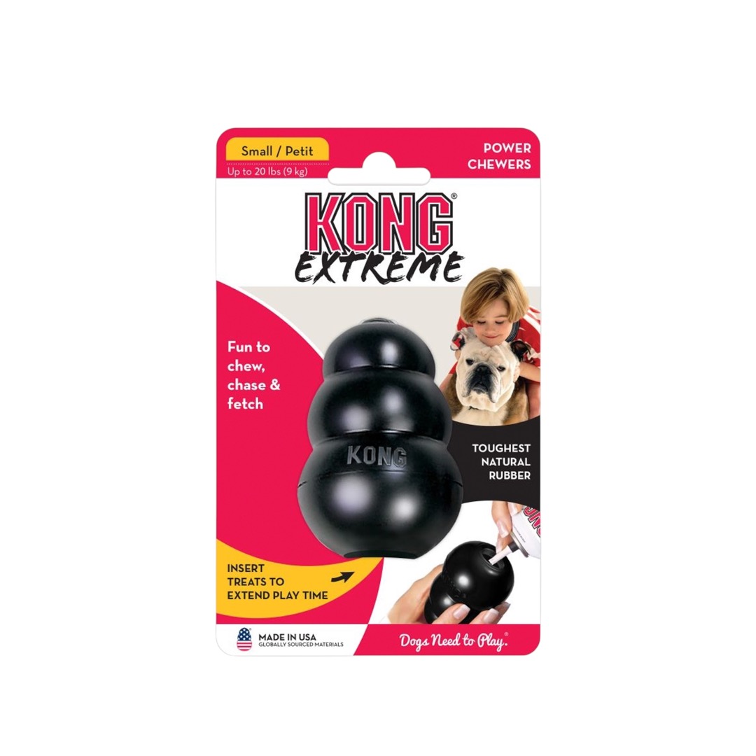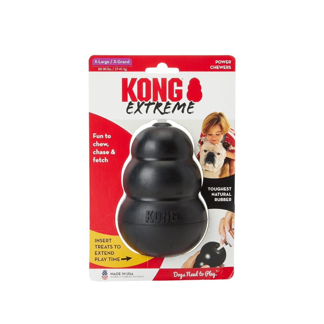 “The KONG Extreme dog toy represents the most durable strength of KONG rubber. Designed for the toughest of chewers, the KONG Extreme offers enrichment and helps satisfy dogs’ instinctual needs. The KONG unique, ultra-durable, natural rubber formula is designed for determined chewers, while the erratic bounce fulfills a dog’s need to play. Want to extend play time? Be sure to stuff with tempting bits of kibble and entice with a dash of peanut butter. Add to the fun by adding KONG Snacks and top with KONG Easy Treat. Stuff and Freeze for a longer-lasting challenge.Mentally stimulating toy; offering enrichment by helping satisfy dogs’ instinctual needsUnpredictable bounce for games of fetchRecommended worldwide by Veterinarians; Trainers; and dog enthusiastsGreat for stuffing with KONG Easy Treat; Snacks or ZiggiesKONG black rubber formula is specifically designed for power chewersNatural rubber13-30kg”