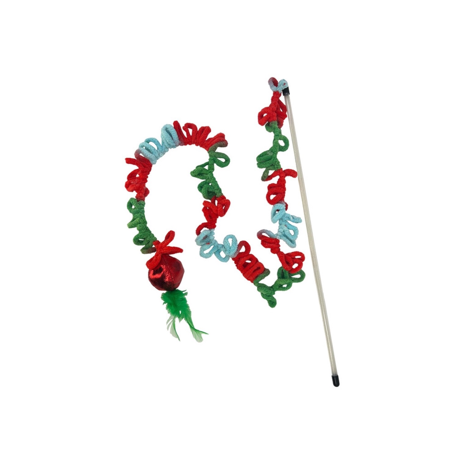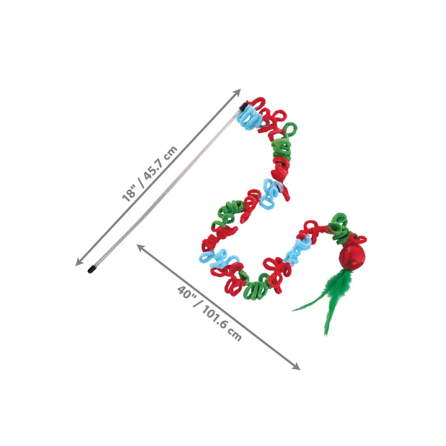 “KONG Holiday Teaser Loopz has an extra-long wand and soft yarn rings that satisfy hunt-and-capture instincts in a dynamic rainbow of holiday color. The chunky yarn rings provide a fulfilling reward while meeting stalking needs. A shiny ball and fluttery feathers give kitties an exciting visual target for pouncing while the ball’s crackling sound keeps cats interested. KONG North American Premium Catnip in the ball boosts mood, keeping kitties playing longer.Special Features:The lure of the holiday-colored yarn rings invites cats to pounce and grab with this extra-long teaser with instinct-igniting feathers on an eye-catching shiny ball at the end—a target for hunting play filled with KONG North American Premium Catnip.Product Details:Materials: 85% Polyester, 11% PVC- Polyvinyl Chloride, 2% Chicken Feathers, 1% Catnip, 1% PE- PolyethyleneWeight: 1.6 ouncesHxWxL: 26.75 x 3.75 x 2.76 inches”