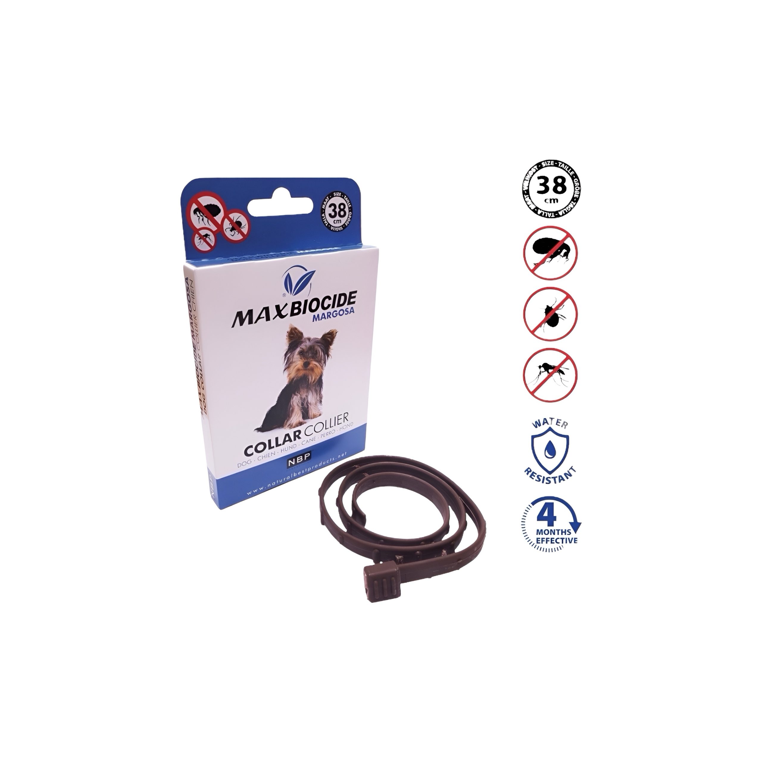 “Max Biocide Dog Collar is a non-toxic collar based on natural oils that effectively repels ticks, fleas and other harmful insects. It contains Indian Zederach extract, which does not irritate the animal’s sense of smell and is suitable for sensitive skin. Waterproof!Main advantages:It protects the animal for at least 4 months.Suitable for puppies from 2 months of age.It contains Indian Zederach extract, which does not irritate the animal’s sense of smell and is suitable for sensitive skin.No resistance is created to the natural Margosan substance, and the collar does not leave a chemical trace in nature.Waterproof.DosageUnpack the collar from the protective foil, attach it to the animal’s neck so that the collar is not too tight and cut off the excess part. It is effective 3 hours after application. It protects the animal for at least 4 months.CompositionNATURAL MARGOS EXTRACT 4.5% TJ 0.54 G, LDPE 95.5%.”