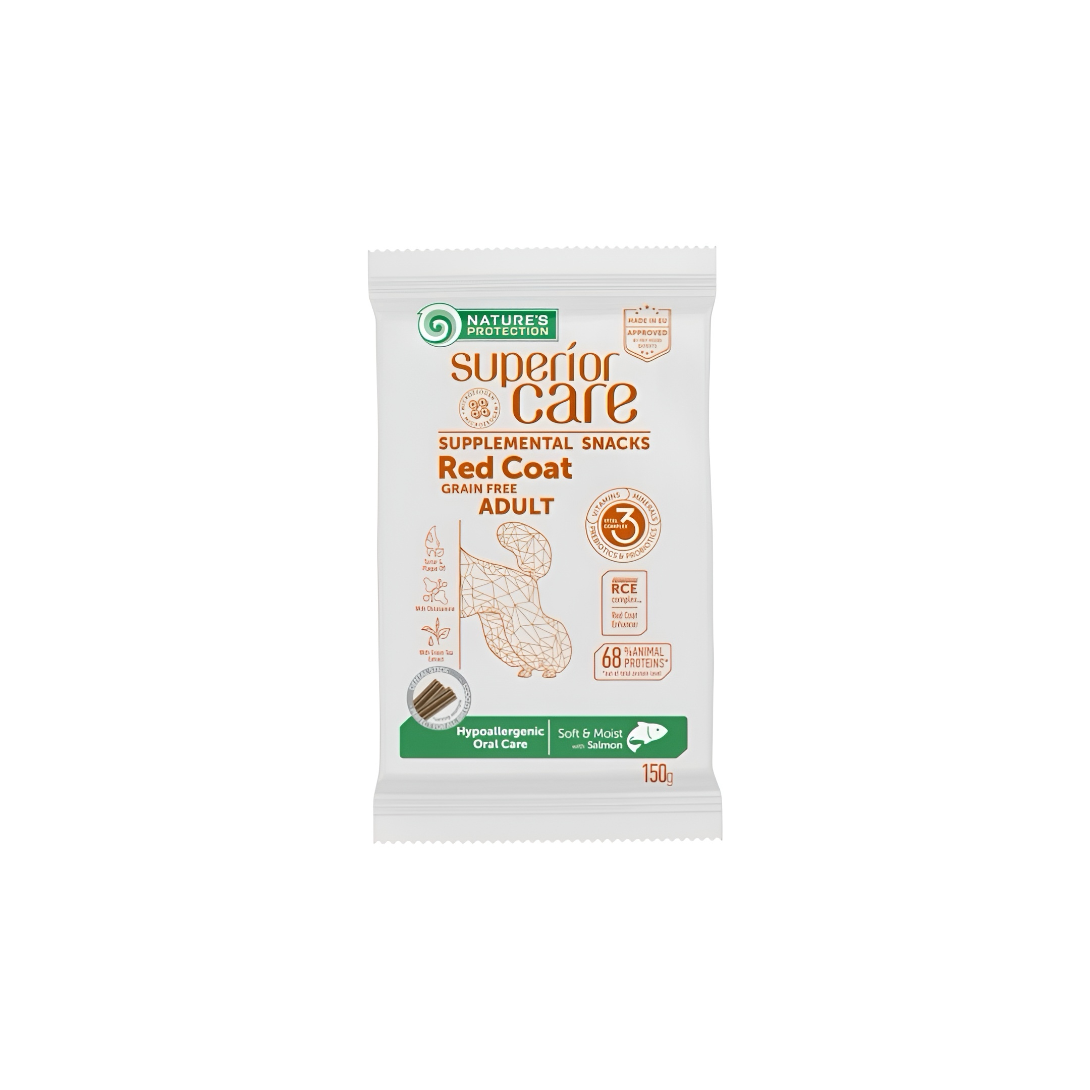 Salmon at least 24% (dried and finely ground), pregelatinized potato starch, hydrolysed feather meal, peas, potato flakes, seaweed Ascophyllum nodosum (6%), sorbitol, glycerin, glucose syrup, pea fiber, sodium polyphosphate (2%), dynamic micronized clinoptilolite (1%), chitosamine (from aquatic animals) (1%), fructooligosaccharides (FOS), green tea extract (0.5%), dried marigold (0.02%).