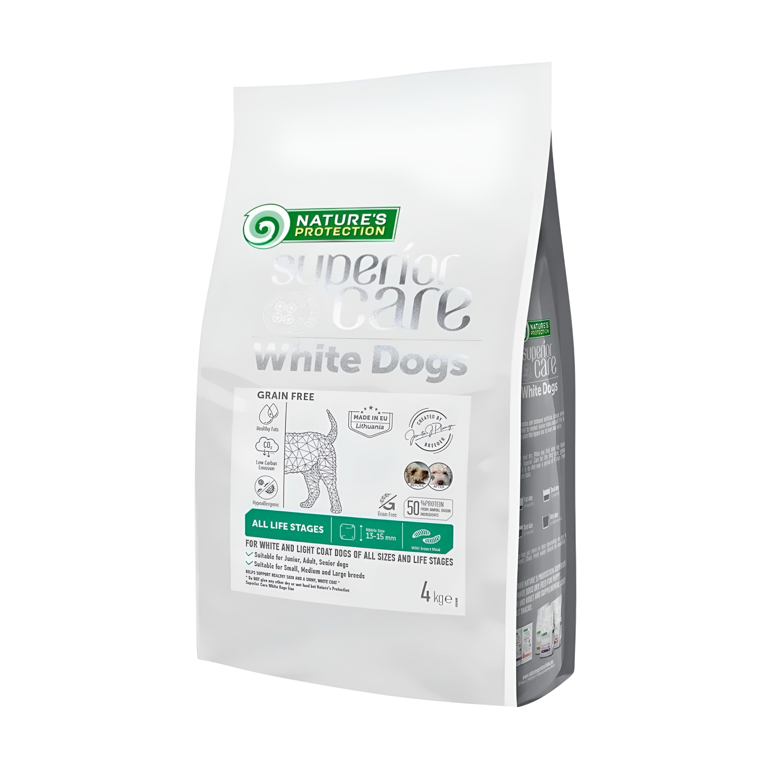 This complete grain free dry dog food contains Tear Stains Off formula – a carefully selected amino acid complex and fully balanced ingredients in the composition which can help to fight brown tear stains around the eyes, mouth, paws, or other parts of the pet’s body. This food kibble size is very versatile, measuring 13-15 mm, making it suitable for dogs of all sizes and ages. Is suitable for larger breeds who prefer to eat smaller kibble and for young dogs who like to eat a larger kibble. The main protein source is insects, which are highly digestible and contain essential nutrients, including chitin and lauric acid, crucial for muscle development, immune system support, and digestive health. The highest quality protein source and raw materials will not only provide your pet with all the efficient nutrients but will also ensure perfect digestibility and palatability for white and light coated dogs.