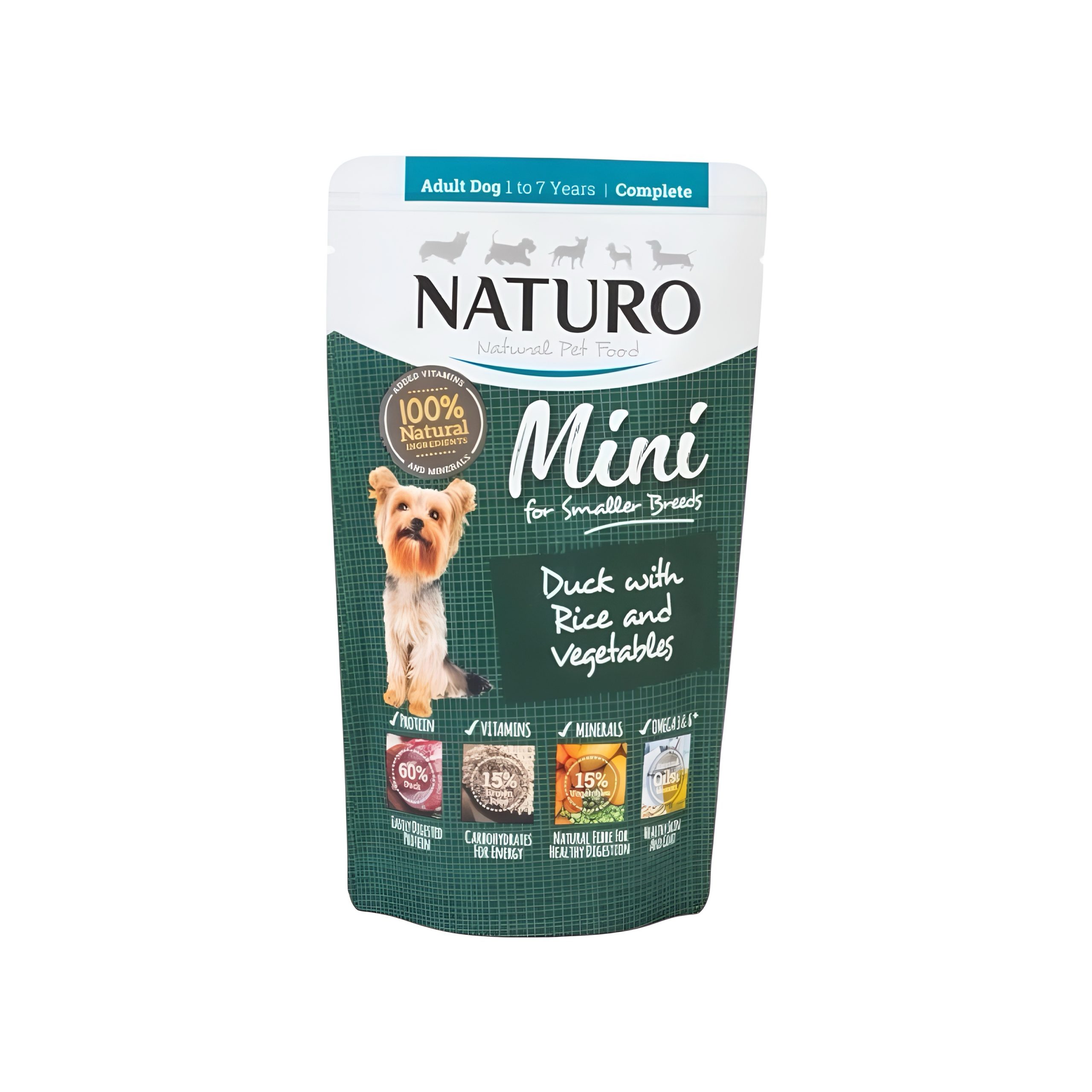 Our delicious wet dog food is 60% duck, a premium protein and a great source of vitamins and minerals. Duck is an ideal alternative for dogs with common food intolerances. This wet dog food also contains 15% vegetables and 15% brown rice, making for an energy-packed, easy-to-digest meal. Omegas 3 and 6 are included in Sunflower and Salmon oils to help maintain healthy skin and promote a healthy coat for your Adult Dog throughout his life. Naturo contains 100% natural ingredients with added vitamins, minerals and calcium to support your dog’s immune system, teeth and bones. Our recipe contains no added artificial colors, flavors or preservatives, providing the best natural and hypoallergenic dog food for your dog. our cousin, Recipe:60% Duck15% Vegetables15% Rice: A non-allergenic source of fiber and energy and in the form of highly digestible carbohydrates, it’s also gentle on your dog’s stomach.Essential Oils and Minerals: Healthy skin and coat Benefits: Optimum Weight Strong Bones and Joints Palatable Food Good Skin and Coat Strong Immune System Healthy Digestive System Adult Dog 150g (Trays): Daily Amount Body Weight 150g Tray Only With dry food 150g Trayup to 5 kg1-2 trays1 tray5-10 kg2-3½ trays1½-2 Trays