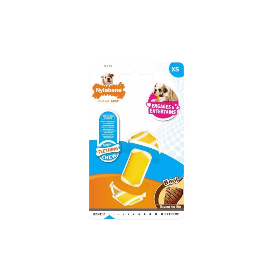 “Give your pup something fun to chomp on with the Nylabone Rawhide Alternative Knot Puppy Teething Toy.Made from gentle material, this bone is a safe alternative to rawhide and packed with savory beef flavor. It helps relieve teething discomfort and discourages destructive chewing in puppies up to 11kg.Key Benefits:Made of a soft, gentle material specifically designed for teething.Safer and mess-free alternative to traditional rawhide toys.Can be frozen to help provide your pup with extra comfort.”
