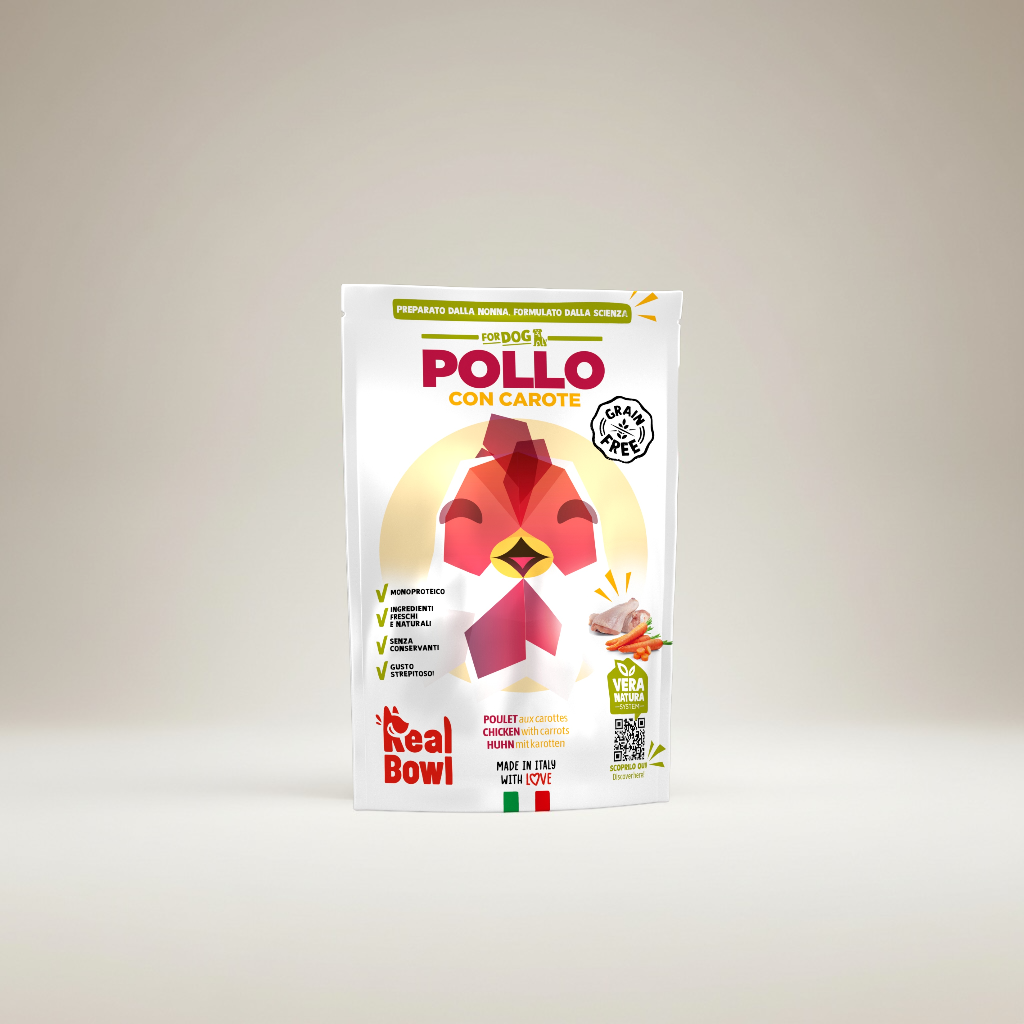 Real Bowl Chicken Grain Free is a complete food for dogs of all sizes.Real Bowl recipes contain only fresh human-grade ingredients, and their formulation is balanced to ensure the proper daily caloric intake. The product is to be considered a home-style meal, offering the convenience of quick use and storage outside the refrigerator.Composition:Chicken (69.7%), potatoes (14.8%), carrots (14.6%), minerals, rosemary (0.2%), sunflower oil (0.1%).Analytical Constituents:Moisture 70%, Crude protein 12.5%, Crude fat 8.44%, Crude ash 2.27%, Crude fibre 0.6%.Additives per kg:Vitamin A 2800 IU, Vitamin D3 280 IU, Vitamin E 45 mg, Biotin 6 µg.Trace elements: Zinc 16 mg, Copper 2.0 mg, Iron 16 mg, Manganese 1.9 mg, Iodine 1.27 mg.Storage:Store in a cool, dry place. Once opened, keep refrigerated and use within 2 days. Transport does not require refrigeration.Shelf life: 36 months from production date.Available sizes: 150g, 400g, 700g.