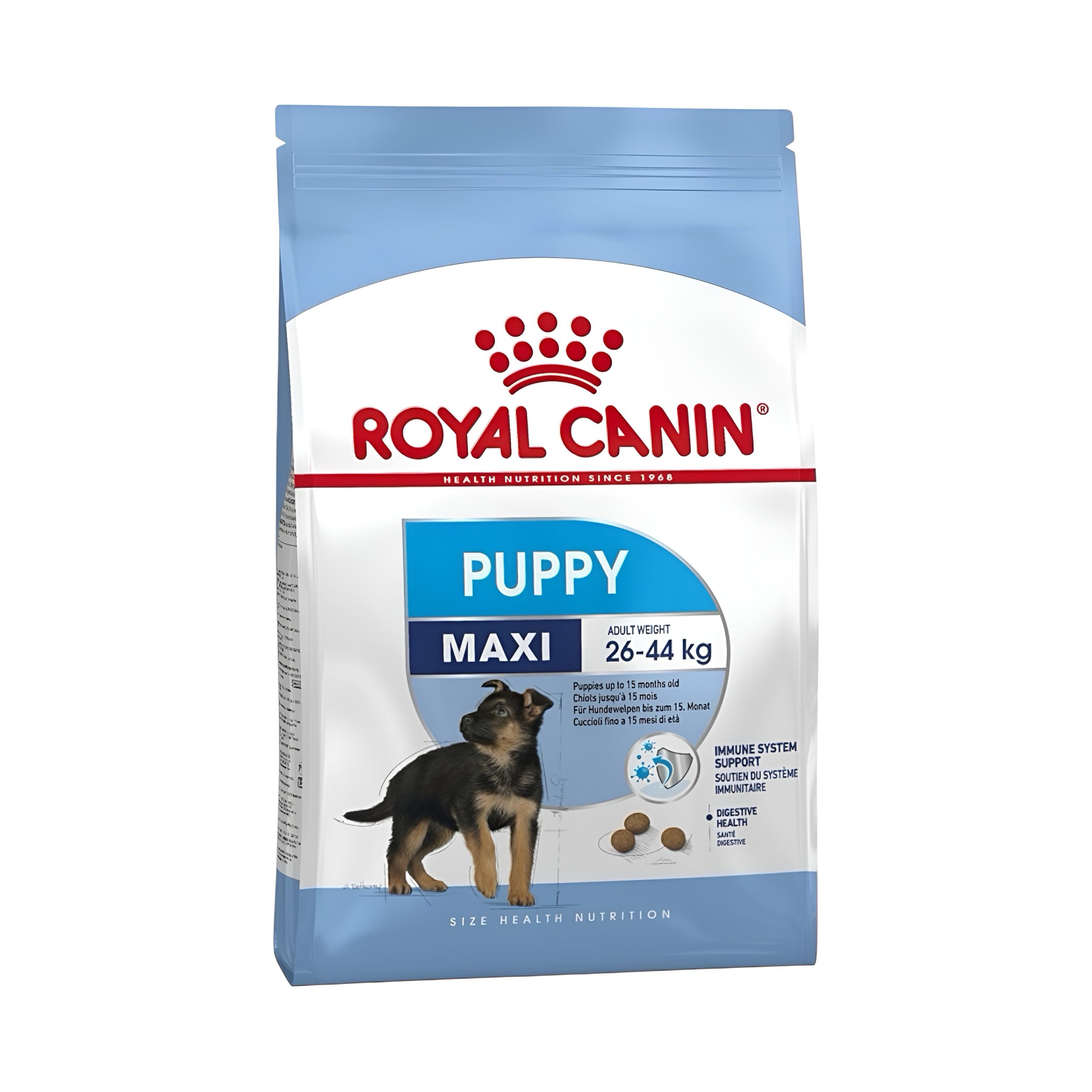 Complete feed for dogs – For large breed puppies (adult weight from 26 to 44 kg) – Up to 15 months old.ROYAL CANIN® Maxi Puppy is specially formulated with the nutritional needs of your large puppy in mind. This food is suitable for large puppies from 2 to 15 months old that will have an adult weight of approximately 26kg-44kg. ROYAL CANIN® Maxi Puppy food contains a patented complex of antioxidants – including the highly beneficial vitamin E – to support your puppy’s natural defences while its immune system is immature and still developing. The combination of nutrients that contain high quality protein (such as L.I.P., known for its very high digestibility) as well as prebiotics like FOS help to support your puppy’s digestive health Large puppies have a long growth period, that’s why they need a diet that accounts for the implications of this period. Fortunately, ROYAL CANIN® Maxi Puppy contains a moderate energy level to meet your puppy’s energy needs. A variation of ROYAL CANIN® Maxi Puppy dry food is also available depending on your puppy’s lifestyle. If your large puppy is quite active then it will have higher energy needs, if this is the case then why not try ROYAL CANIN® Maxi Puppy Active.Composition: dehydrated poultry protein, rice, maize flour, vegetable protein isolate*, animal fats, maize, wheat flour, hydrolysed animal proteins, beet pulp, maize gluten, minerals, vegetable fibres, soya oil, fish oil, fructo-oligo-saccharides (0.34%), psyllium husks and seeds, hydrolysed yeast (source of manno-oligo-saccharides), yeasts extracts (source of betaglucans), marigold extract (source of lutein), hydrolysed crustaceans (source of glucosamine), hydrolysed cartilage (source of chondroitin).Additives (per kg): Nutritional additives: Vitamin A: 15500 IU, Vitamin D3: 1000 IU, Vitamin E: 480 mg, E1 (Iron): 42 mg, E2 (Iodine): 4.2 mg, E4 (Copper): 13 mg, E5 (Manganese): 55 mg, E6 (Zinc): 132 mg, E8 (Selenium): 0.07 mg – Technological additives: Clinoptilolite of sedimentary origin: 10 g – Sensory additives: Yucca extract: 125 mg – Preservatives – Antioxidants.Analytical constituants: Protein: 30.0% – Fat content: 16.0% – Crude ash: 7.7% – Crude fibres: 2.4%.