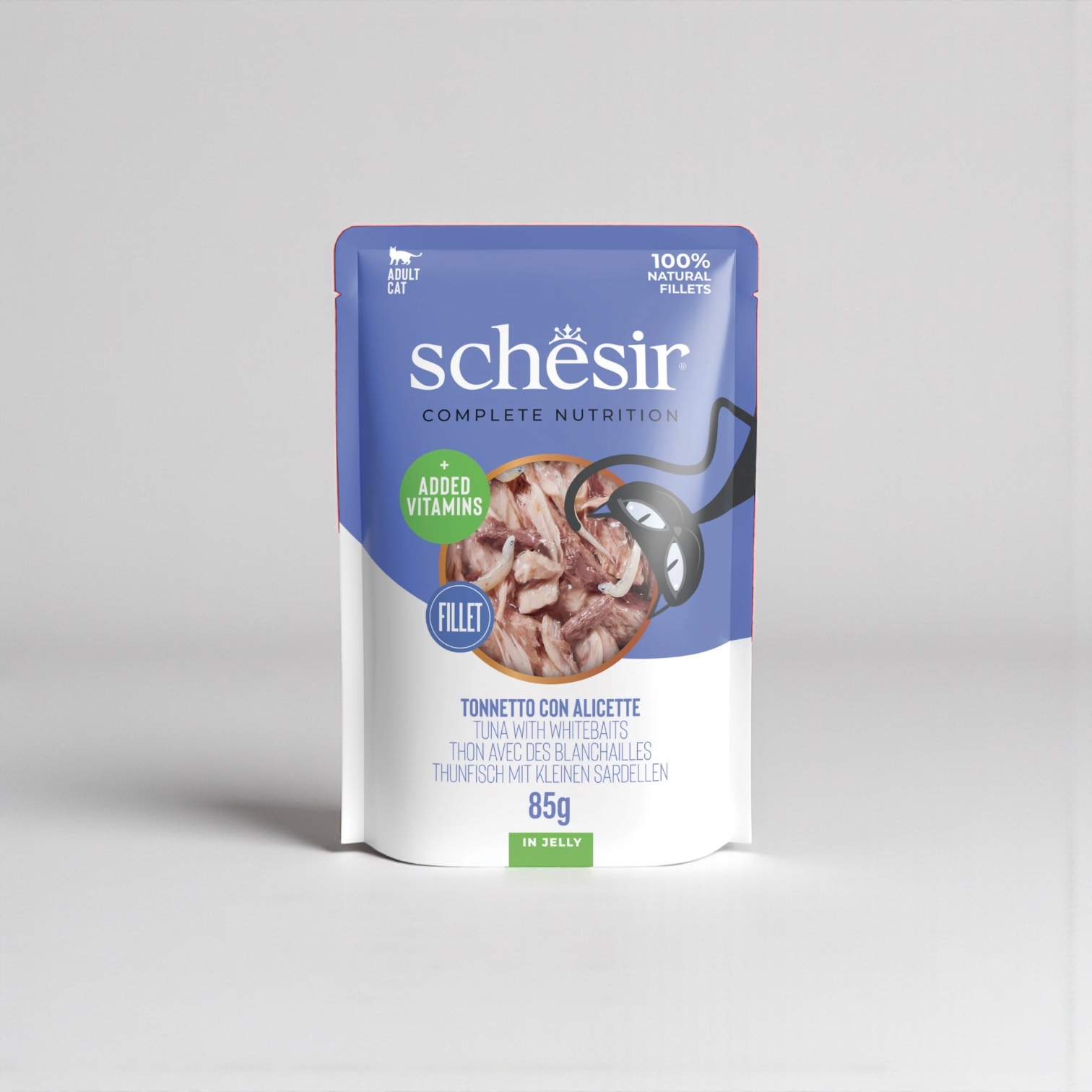 Complete wet food for adult catsReal steamed tuna fillets with whole fish in jelly for a natural and irresistible mix.• Tuna caught in the open sea• Few simple, natural ingredients• High in protein, low in carbohydrates• Promotes extra hydration• In soft jellyAnalytical Constituents:• Protein: 16.7%• Crude fat: 0.6%• Crude fibre: 0.1%• Crude ash: 1.7%• Moisture: 79%