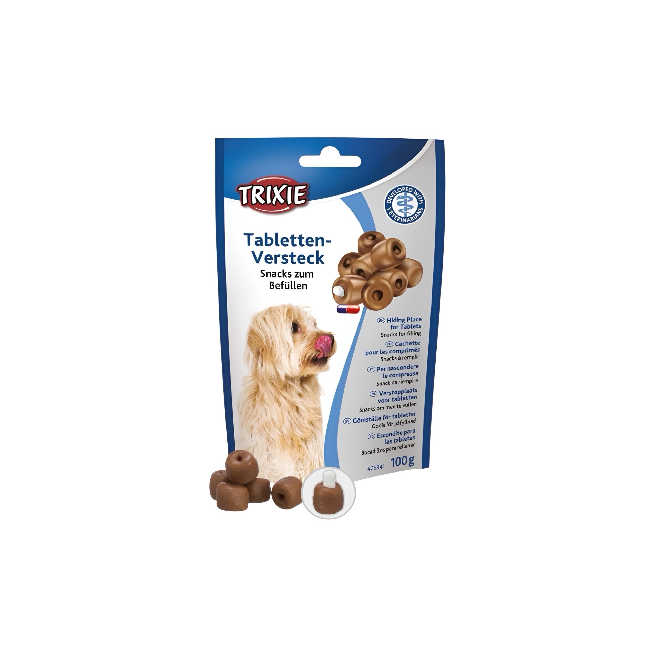 Hiding place for tablets. Makes giving medication easier. Press the tablet into the opening and close it by squeezing it together.