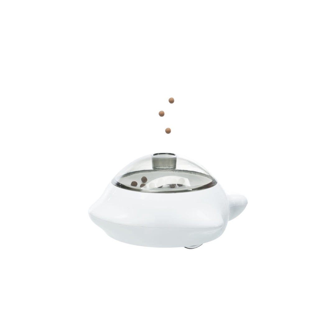 “OverviewAn unusual device that will make your pet use its intelligence and actively move. After all, a treat or food from this feeder can be obtained only when you push it forward or backward. The favorite will play enough and won’t eat too much.The feeder is made of safe plasticHas wheelsThe cover is removableMeets animal protection requirements in accordance with Section 18 (AT)Dimensions: 21×10×12 cm”